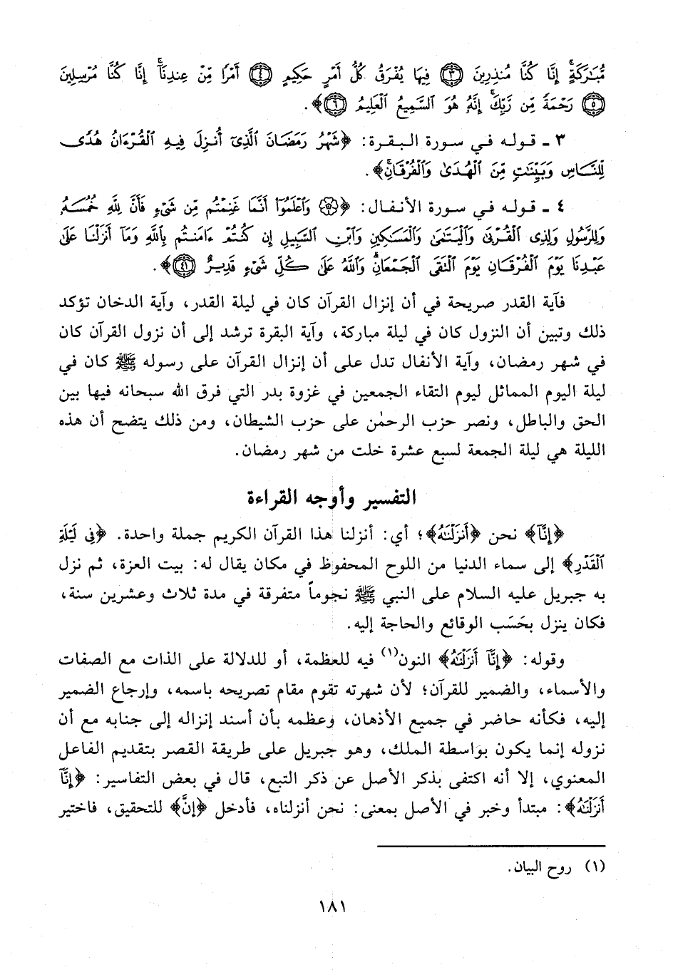 فآية القدر صريحة في أن إنزال القرآن كان في ليلة القدر، وآية الدخان تؤكد ذلك وتبين أن النزول كان في ليلة مباركة، وآية البقرة ترشد إلى أن نزول القرآن كان في شهر رمضان، وآية الأنفال تدل على أن إنزال القرآن على رسوله - صلى الله عليه وسلم - كان في ليلة اليوم المماثل ليوم التقاء الجمعين في غزوة بدر التي فرق الله سبحانه فيها بين الحق والباطل، ونصر حزب الرحمن على حزب الشيطان، ومن ذلك يتضح أن هذه الليلة هي ليلة الجمعة لسبع عشرة خلت من شهر رمضان.