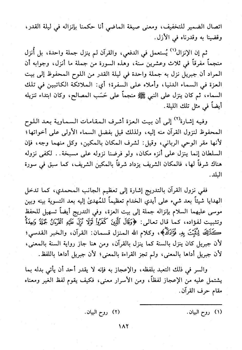 ففي نزول القرآن بالتدريج إشارة إلى تعظيم الجانب المحمدي، كما تدخل الهدايا شيئًا بعد شيء على أيدي الخدام تعظيمًا للمُهدى إليه بعد التسوية بينه وبين موسى عليهما السلام بإنزاله جملة إلى بيت العزة، وفي التدريج أيضًا تسهيل للحفظ وتثبيت لفؤاده، كما قال تعالى: {وَقَالَ الَّذِينَ كَفَرُوا لَوْلَا نُزِّلَ عَلَيْهِ الْقُرْآنُ جُمْلَةً وَاحِدَةً كَذَلِكَ لِنُثَبِّتَ بِهِ فُؤَادَكَ}، وكلام الله المنزل قسمان: القرآن، والخبر القدسي؛ لأن جبريل كان ينزل بالسنة كما ينزل بالقرآن، ومن هنا جاز رواية السنة بالمعنى، لأن جبريل أداها بالمعنى، ولم تجز القراءة بالمعنى؛ لأن جبريل أداها باللفظ.