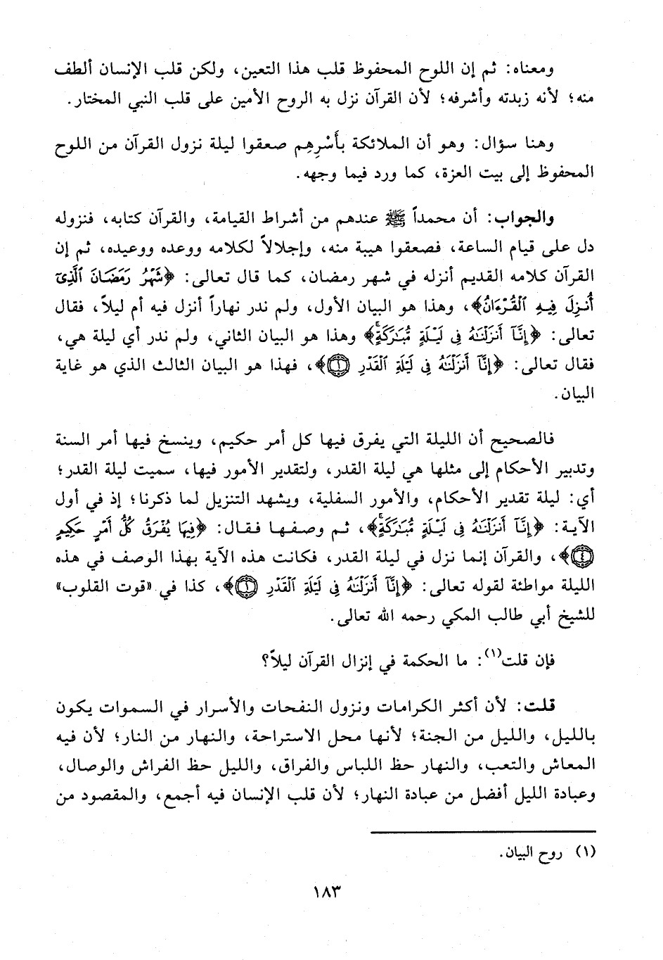 فإن قلت (¬1): ما الحكمة في إنزال القرآن ليلًا؟