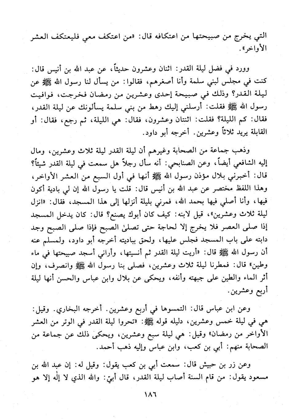 وعن ابن عباس قال: التمسوها في أربع وعشرين. أخرجه البخاري. وقيل: هي في ليلة خمس وعشرين، دليله قوله - صلى الله عليه وسلم -: "تحروا ليلة القدر في الوتر من العشر الأواخر من رمضان" وقيل: هي ليلة سبع وعشرين، ويحكى ذلك عن جماعة من الصحابة منهم: أبي بن كعب، وابن عباس وإليه ذهب أحمد.