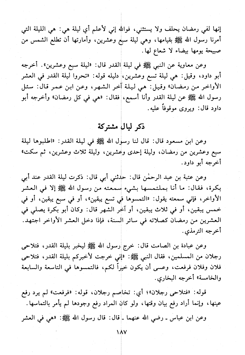 وعن ابن مسعود قال: قال لنا رسول الله - صلى الله عليه وسلم - في ليلة القدر: "اطلبوها ليلة سبع وعشرين من رمضان، وليلة إحدى وعشرين، وليلة ثلاث وعشرين، ثم سكت" أخرجه أبو داود.