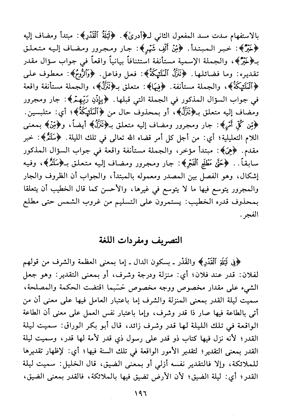 بالاستفهام سدت مسد المفعول الثاني لـ {أدرى}. {لَيْلَةُ الْقَدْرِ}: مبتدأ ومضاف إليه {خَيْرٌ}: خبر المبتدأ. {مِنْ أَلْفِ شَهْرٍ}: جار ومجرور ومضاف إليه متعلق بـ {خَيْرٌ}، والجملة الإسمية مستأنفة استئنافًا بيانيًا واقعًا في جواب سؤال مقدر تقديره: وما فضائلها. {تَنَزَّلُ الْمَلَائِكَةُ}: فعل وفاعل. {وَالرُّوحُ}: معطوف على {الْمَلَائِكَةُ}، والجملة مستأنفة. {فِيهَا}: متعلق بـ {تَنَزَّلُ}، والجملة مستأنفة واقعة في جواب السؤال المذكور في الجملة التي قبلها. {بِإِذْنِ رَبِّهِمْ}: جار ومجرور ومضاف إليه متعلق بـ {تَنَزَّلُ}، أو بمحذوف حال من {الْمَلَائِكَةُ}؛ أي: متلبسين. {مِنْ كُلِّ أَمْرٍ}: جار ومجرور ومضاف إليه متعلق بـ {تَنَزَّلُ} أيضًا، و {مِنْ} بمعنى اللام التعليلية؛ أي: من أجل كل أمر قضاه الله تعالى في تلك الليلة. {سَلَامٌ}: خبر مقدم. {هِيَ}: مبتدأ مؤخر، والجملة مستأنفة واقعة في جواب السؤال المذكور سابقًا .. {حَتَّى مَطْلَعِ الْفَجْرِ}: جار ومجرور ومضاف إليه متعلق بـ {سَلَامٌ}، وفيه إشكال، وهو الفصل بين المصدر ومعموله بالمبتدأ، والجواب أن الظروف والجار والمجرور يتوسع فيها ما لا يتوسع في غيرها، والأحسن كما قال الخطيب أن يتعلقا بمحذوف قدره الخطيب: يستمرون على التسليم من غروب الشمس حتى مطلع الفجر.