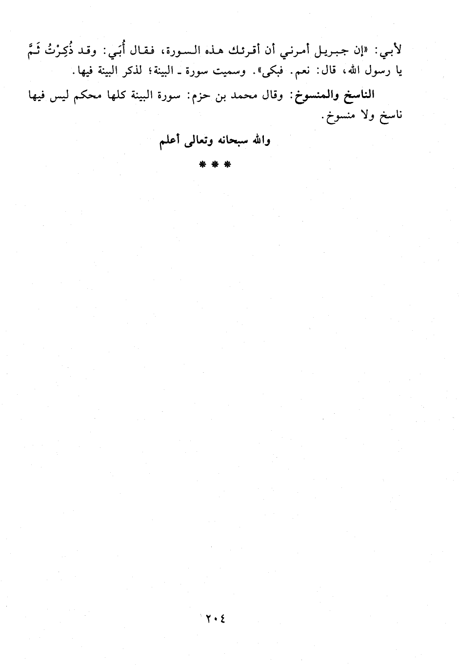 الناسخ والمنسوخ: وقال محمد بن حزم: سورة البينة كلها محكم ليس فيها ناسخ ولا منسوخ.