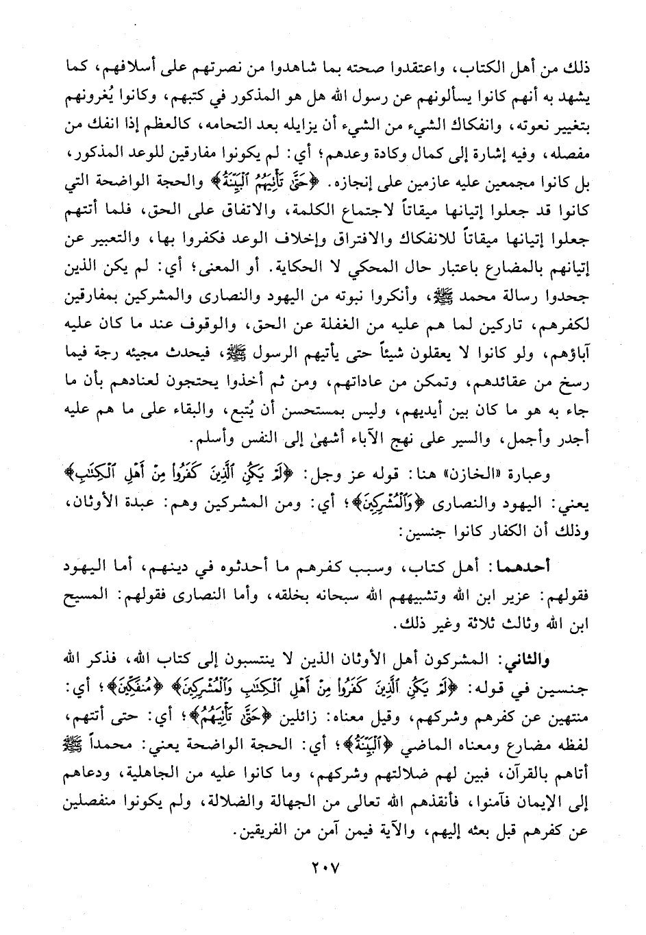 والثاني: المشركون أهل الأوثان الذين لا ينتسبون إلى كتاب الله، فذكر الله جنسين في قوله: {لَمْ يَكُنِ الَّذِينَ كَفَرُوا مِنْ أَهْلِ الْكِتَابِ وَالْمُشْرِكِينَ} {مُنْفَكِّينَ}؛ أي: منتهين عن كفرهم وشركهم، وقيل معناه: زائلين {حَتَّى تَأْتِيَهُم}؛ أي: حتى أتتهم، لفظه مضارع ومعناه الماضي {الْبَيِّنَةُ}؛ أي: الحجة الواضحة يعني: محمدًا - صلى الله عليه وسلم - أتاهم بالقرآن، فبين لهم ضلالتهم وشركهم، وما كانوا عليه من الجاهلية، ودعاهم إلى الإيمان فآمنوا، فانقذهم الله تعالى من الجهالة والضلالة، ولم يكونوا منفصلين عن كفرهم قبل بعثه إليهم، والآية فيمن آمن من الفريقين.