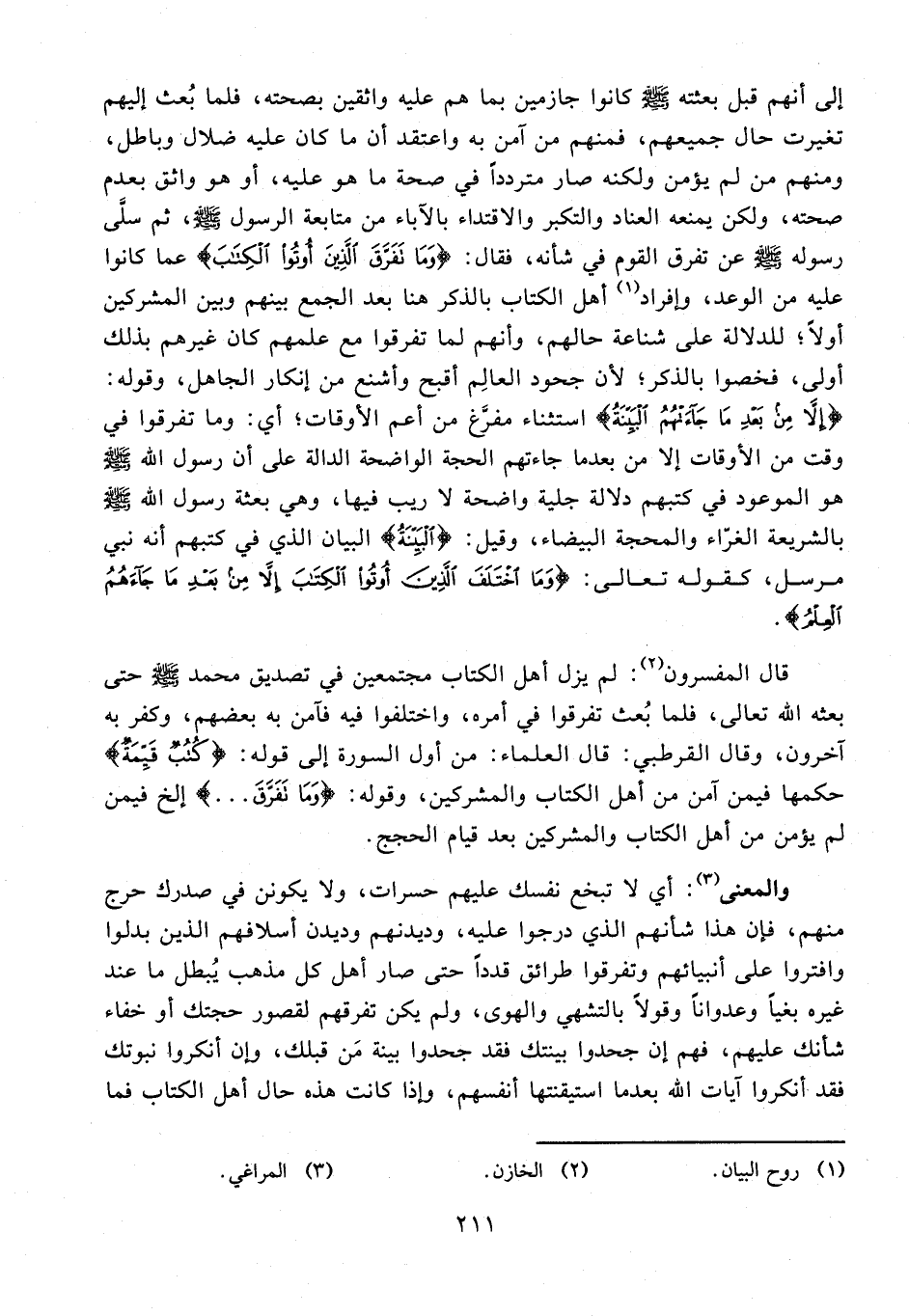 قال المفسرون (¬2): لم يزل أهل الكتاب مجتمعين في تصديق محمد - صلى الله عليه وسلم - حتى بعثه الله تعالى، فلما بُعث تفرقوا في أمره، واختلفوا فيه فآمن به بعضهم، وكفر به آخرون، وقال القرطبي: قال العلماء: من أول السورة إلى قوله: {كُتُبٌ قَيِّمَةٌ} حكمها فيمن آمن من أهل الكتاب والمشركين، وقوله: {وَمَا تَفَرَّقَ ....} إلخ فيمن لم يؤمن من أهل الكتاب والمشركين بعد قيام الحجج.