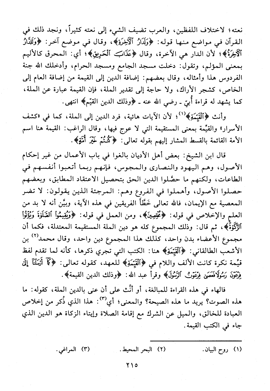 وأنث {الْقَيِّمَةِ} (¬1)؛ لأن الآيات هائية، فرد الدين إلى الملة، كما في "كشف الأسرار" والقيِّمة بمعنى المستقيمة التي لا عوج فيها، وقال الراغب: القيمة هنا اسم الأمة القائمة بالقسط المشار إليهم بقوله تعالى: {كُنْتُمْ خَيْرَ أُمَّةٍ}.