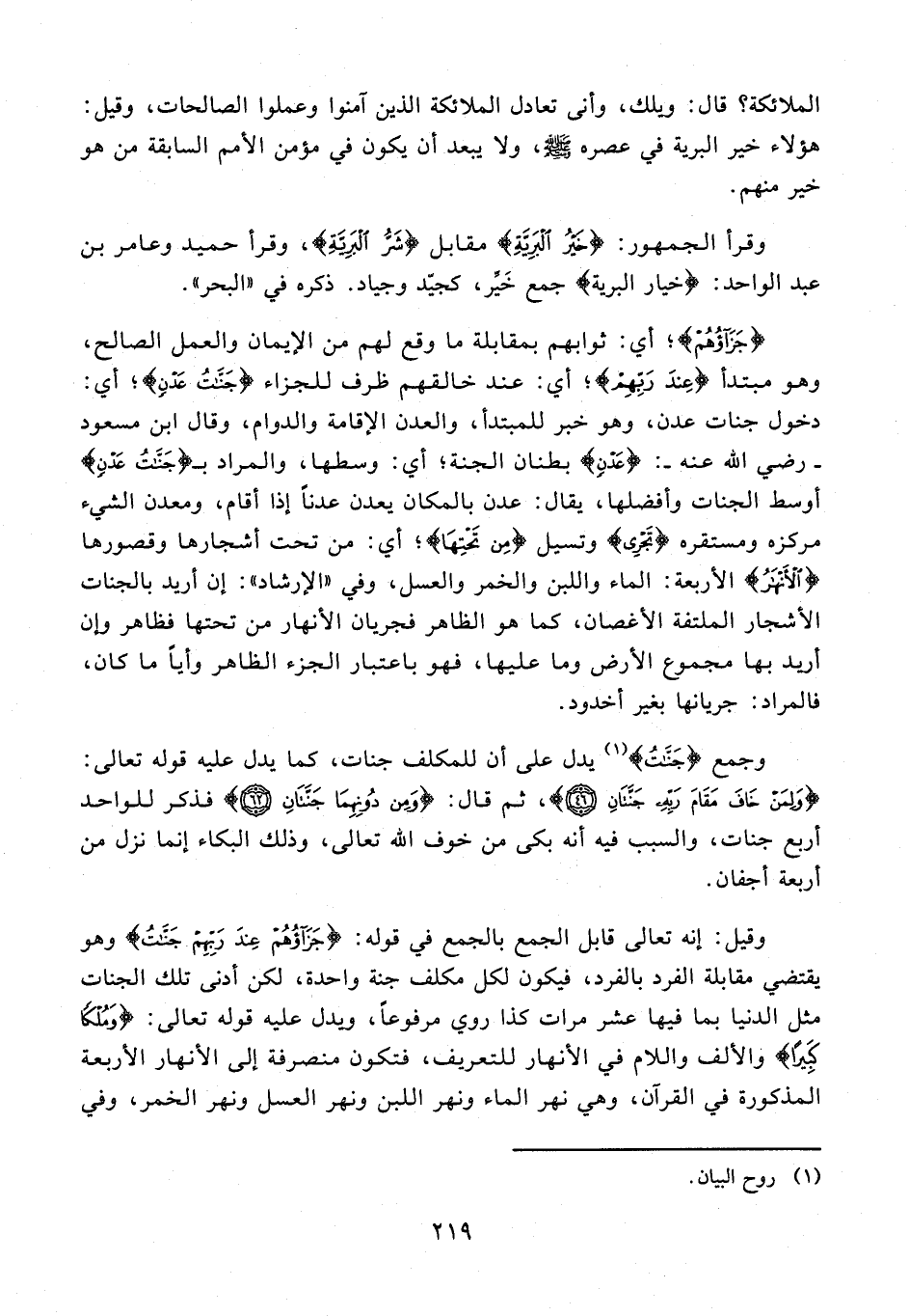 وقيل: إنه تعالى قابل الجمع بالجمع في قوله: {جَزَاؤُهُمْ عِنْدَ رَبِّهِمْ جَنَّاتُ} وهو يقتضي مقابلة الفرد بالفرد، فيكون لكل مكلف جنة واحدة، لكن أدنى تلك الجنات مثل الدنيا بما فيها عشر مرات كذا روي مرفوعًا، ويدل عليه قوله تعالى: {وَمُلْكًا كَبِيرًا} والألف واللام في الأنهار للتعريف، فتكون منصرفة إلى الأنهار الأربعة المذكورة في القرآن، وهي نهر الماء ونهر اللبن ونهر العسل ونهر الخمر، وفي