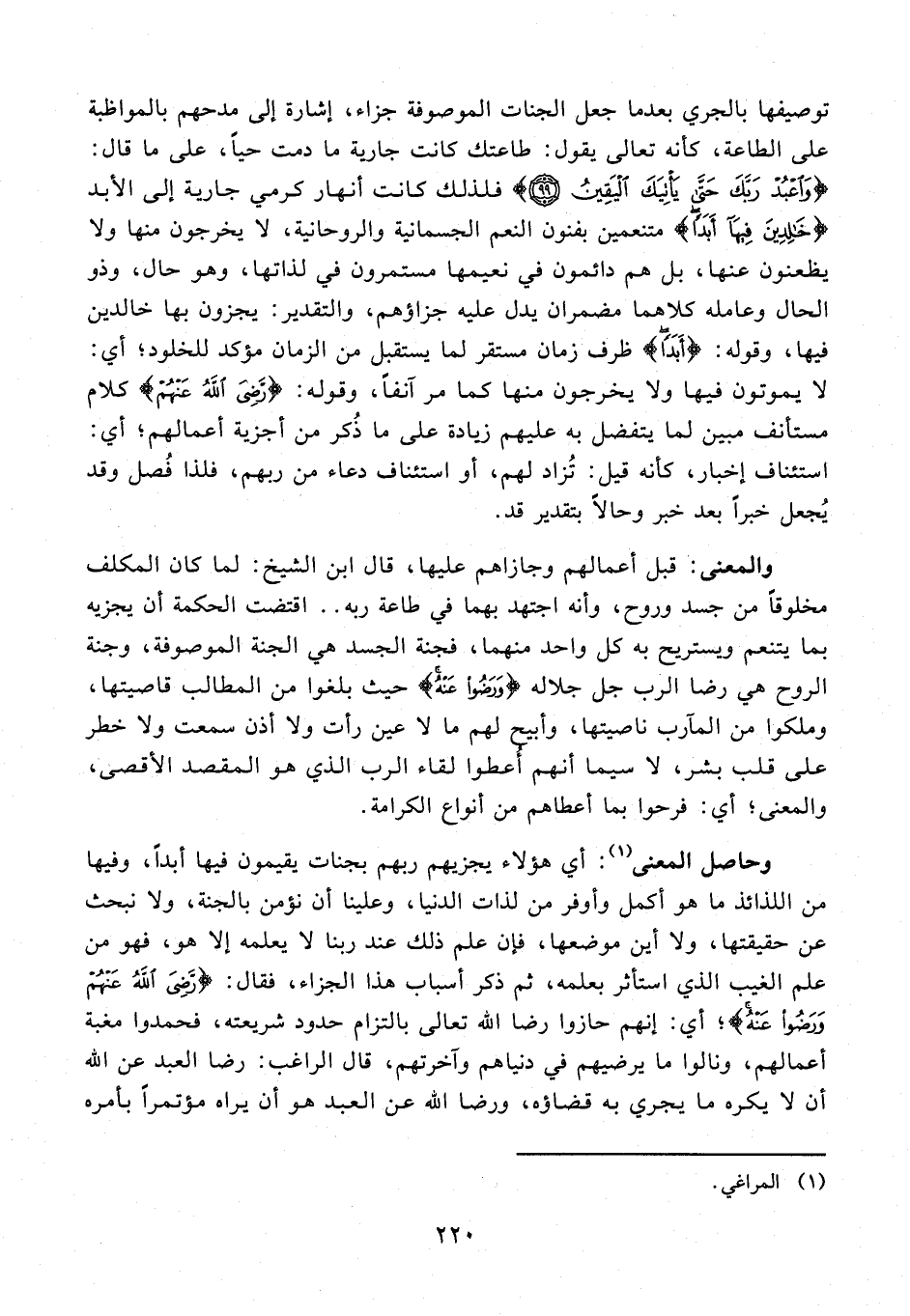 توصيفها بالجري بعدما جعل الجنات الموصوفة جزاء، إشارة إلى مدحهم بالمواظبة على الطاعة، كأنه تعالى يقول: طاعتك كانت جارية ما دمت حيًا، على ما قال: {وَاعْبُدْ رَبَّكَ حَتَّى يَأْتِيَكَ الْيَقِينُ (99)} فلذلك كانت أنهار كرمي جارية إلى الأبد {خَالِدِينَ فِيهَا أَبَدًا} متنعمين بفنون النعم الجسمانية والروحانية، لا يخرجون منها ولا يظعنون عنها، بل هم دائمون في نعيمها مستمرون في لذاتها، وهو حال، وذو الحال وعامله كلاهما مضمران يدل عليه جزاؤهم، والتقدير: يجزون بها خالدين فيها، وقوله: {أَبَدًا} ظرف زمان مستقر لما يستقبل من الزمان مؤكد للخلود؛ أي: لا يموتون فيها ولا يخرجون منها كما مر آنفًا، وقوله: {رَضِيَ اللَّهُ عَنْهُمْ} كلام مستأنف مبين لما يتفضل به عليهم زيادة على ما ذُكر من أجزية أعمالهم؛ أي: استئناف إخبار، كأنه قيل: تُزاد لهم، أو استئناف دعاء من ربهم، فلذا فُصل وقد يُجعل خبرًا بعد خبر وحالًا بتقدير قد.