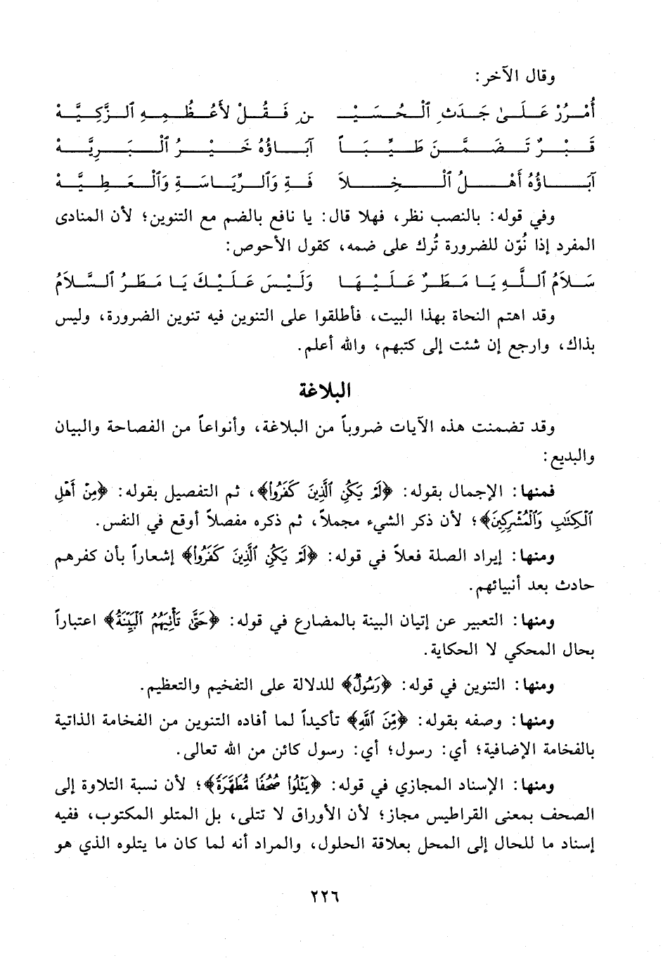 ومنها: التعبير عن إتيان البينة بالمضارع في قوله: {حَتَّى تَأْتِيَهُمُ الْبَيِّنَةُ} اعتبارًا بحال المحكي لا الحكاية.