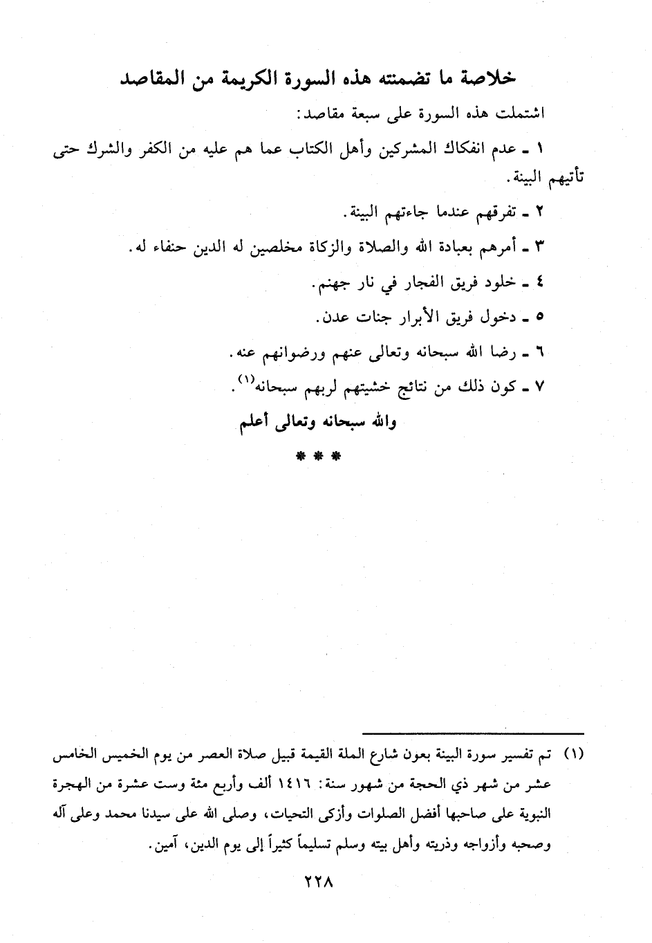(¬1) تم تفسير سورة البينة بعون شارع الملة القيمة قبيل صلاة العصر من يوم الخميس الخامس عشر من شهر ذي الحجة من شهور سنة: 1416 ألف وأربع مئة وست عشرة من الهجرة النبوية على صاحبها أفضل الصلوات وأزكى التحيات، وصلى الله على سيدنا محمد وعلى آله وصحبه وأزواجه وذريته وأهل بيته وسلم تسليمًا كثيرًا إلى يوم الدين، آمين.