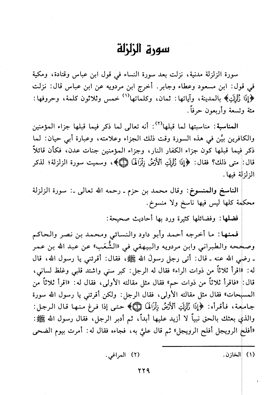 الناسخ والمنسوخ: وقال محمد بن حزم - رحمه الله تعالى -: سورة الزلزلة محكمة كلها ليس فيها ناسخ ولا منسوخ.