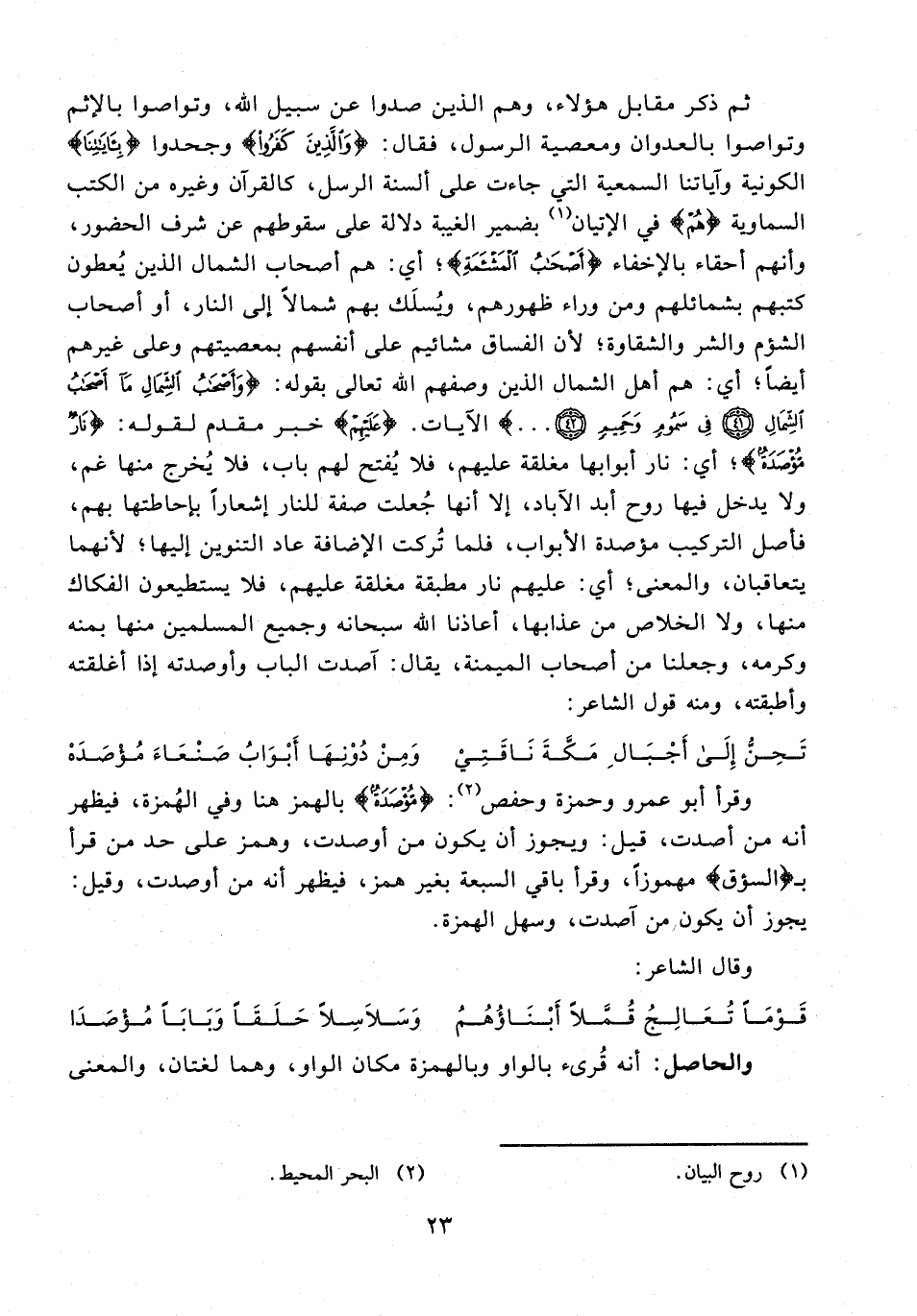 وقرأ أبو عمرو وحمزة وحفص (¬2): {مُؤْصَدَةٌ} بالهمز هنا وفي الهُمزة، فيظهر أنه من أصدت، قيل: ويجوز أن يكون من أوصدت، وهمز على حد من قرأ بـ {السؤق} مهموزًا، وقرأ باقي السبعة بغير همز، فيظهر أنه من أوصدت، وقيل: يجوز أن يكون ومن آصدت، وسهل الهمزة.