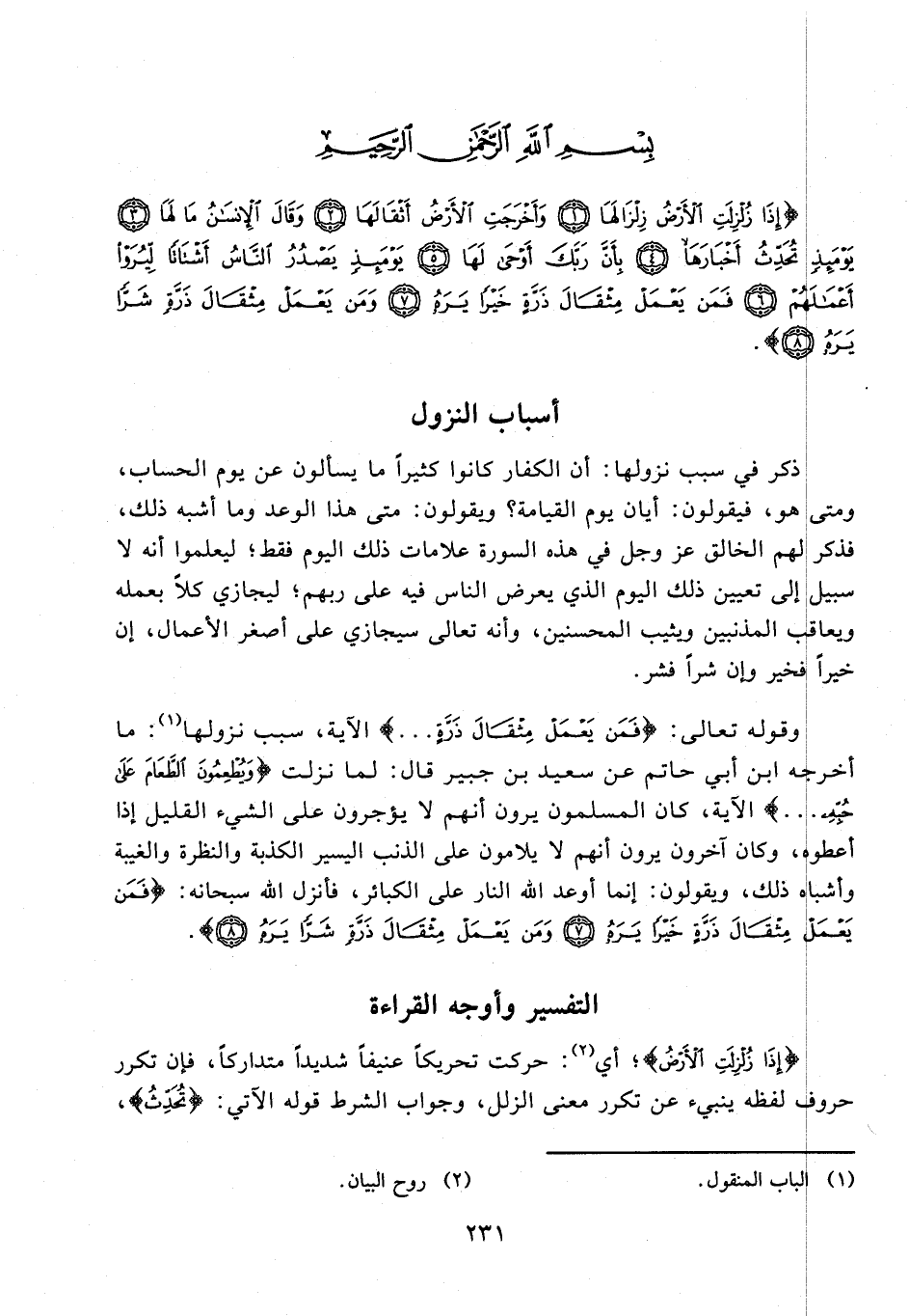 {إِذَا زُلْزِلَتِ الْأَرْضُ زِلْزَالَهَا (1) وَأَخْرَجَتِ الْأَرْضُ أَثْقَالَهَا (2) وَقَالَ الْإِنْسَانُ مَا لَهَا (3) يَوْمَئِذٍ تُحَدِّثُ أَخْبَارَهَا (4) بِأَنَّ رَبَّكَ أَوْحَى لَهَا (5) يَوْمَئِذٍ يَصْدُرُ النَّاسُ أَشْتَاتًا لِيُرَوْا أَعْمَالَهُمْ (6) فَمَنْ يَعْمَلْ مِثْقَالَ ذَرَّةٍ خَيْرًا يَرَهُ (7) وَمَنْ يَعْمَلْ مِثْقَالَ ذَرَّةٍ شَرًّا يَرَهُ (8)}.