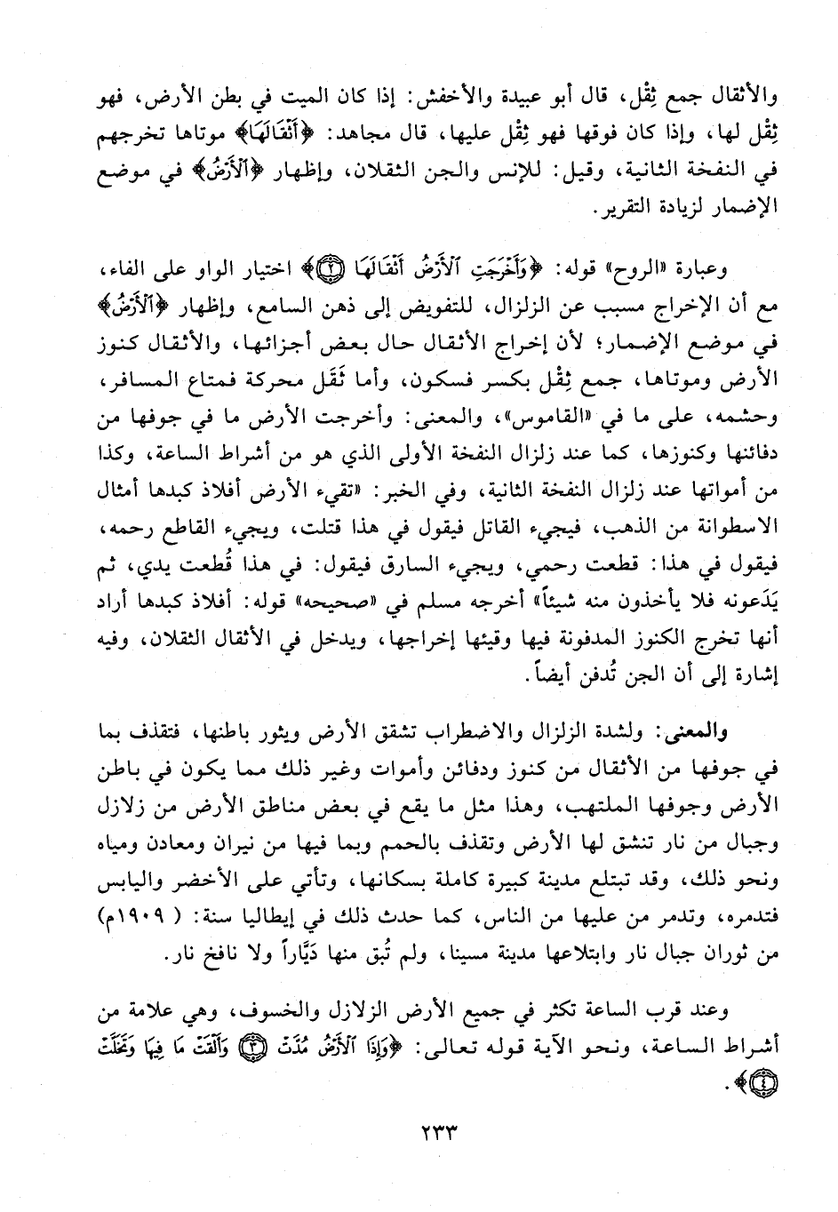 والمعنى: ولشدة الزلزال والاضطراب تشقق الأرض ويثور باطنها، فتقذف بما في جوفها من الأثقال من كنوز ودفائن وأموات وغير ذلك مما يكون في باطن الأرض وجوفها الملتهب، وهذا مثل ما يقع في بعض مناطق الأرض من زلازل وجبال من نار تنشق لها الأرض وتقذف بالحمم وبما فيها من نيران ومعادن ومياه ونحو ذلك، وقد تبتلع مدينة كبيرة كاملة بسكانها، وتأتي على الأخضر واليابس فتدمره، وتدمر من عليها من الناس، كما حدث ذلك في إيطاليا سنة: (1909 م) من ثوران جبال نار وابتلاعها مدينة مسينا, ولم تُبق منها دَيَّارًا ولا نافخ نار.