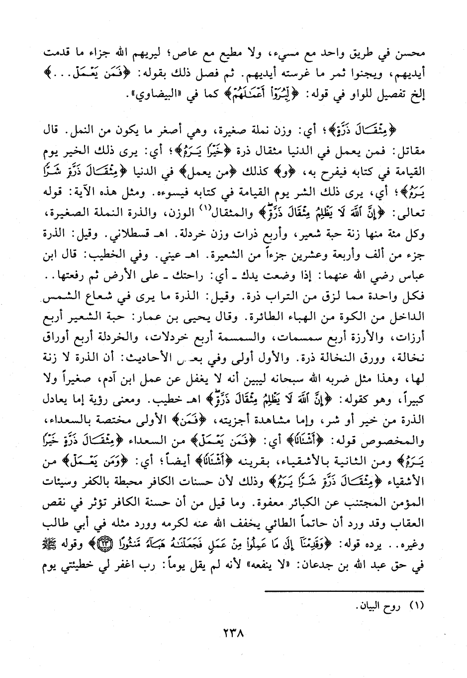 7 - ثم فصل ذلك بقوله: {فَمَنْ يَعْمَلْ ...} إلخ تفصيل للواو في قوله: {لِيُرَوْا أَعْمَالَهُمْ} كما في "البيضاوي". {مِثْقَالَ ذَرَّةٍ}؛ أي: وزن نملة صغيرة، وهي أصغر ما يكون من النمل. قال مقاتل: فمن يعمل في الدنيا مثقال ذرة {خَيْرًا يَرَهُ}؛ أي: يرى ذلك الخير يوم القيامة في كتابه فيفرح به،