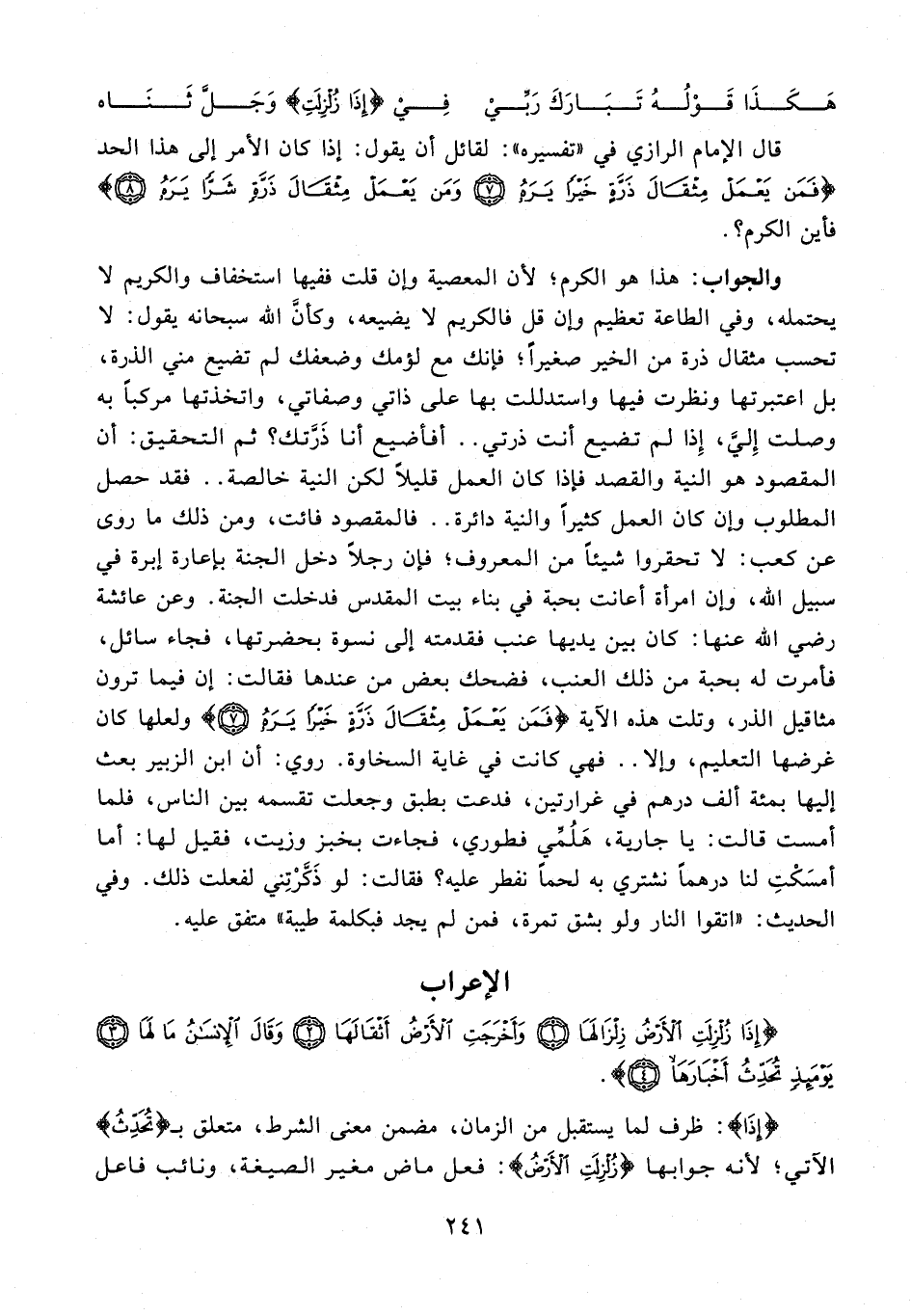 هَكَذَا قَوْلُهُ تَبَارَكَ رَبِّيْ ... فِيْ {إِذَا زُلْزِلَتِ} وَجَلَّ ثَنَاه