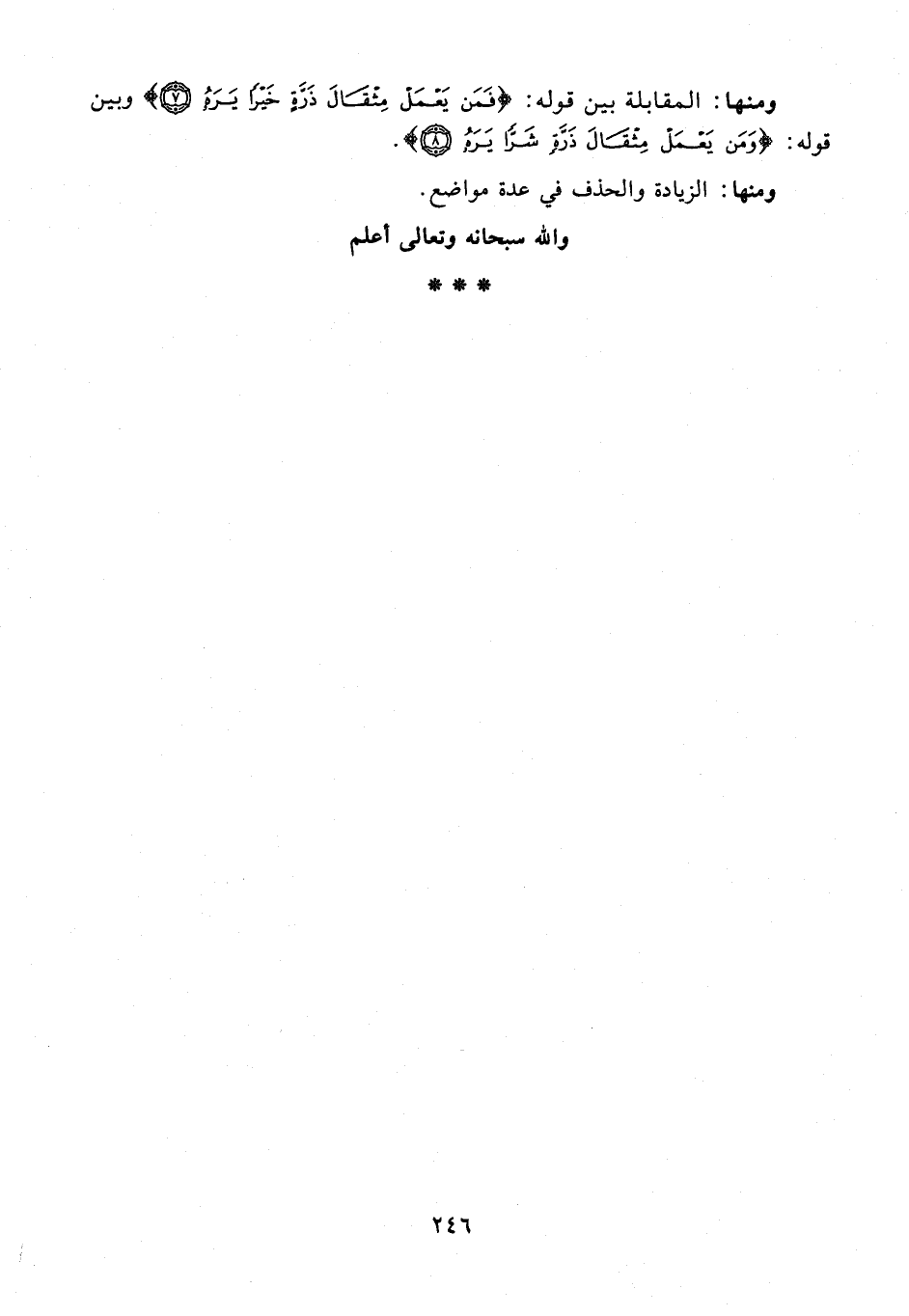 ومنها: المقابلة بين قوله: {فَمَنْ يَعْمَلْ مِثْقَالَ ذَرَّةٍ خَيْرًا يَرَهُ (7)} وبين قوله: {وَمَنْ يَعْمَلْ مِثْقَالَ ذَرَّةٍ شَرًّا يَرَهُ (8)}.
