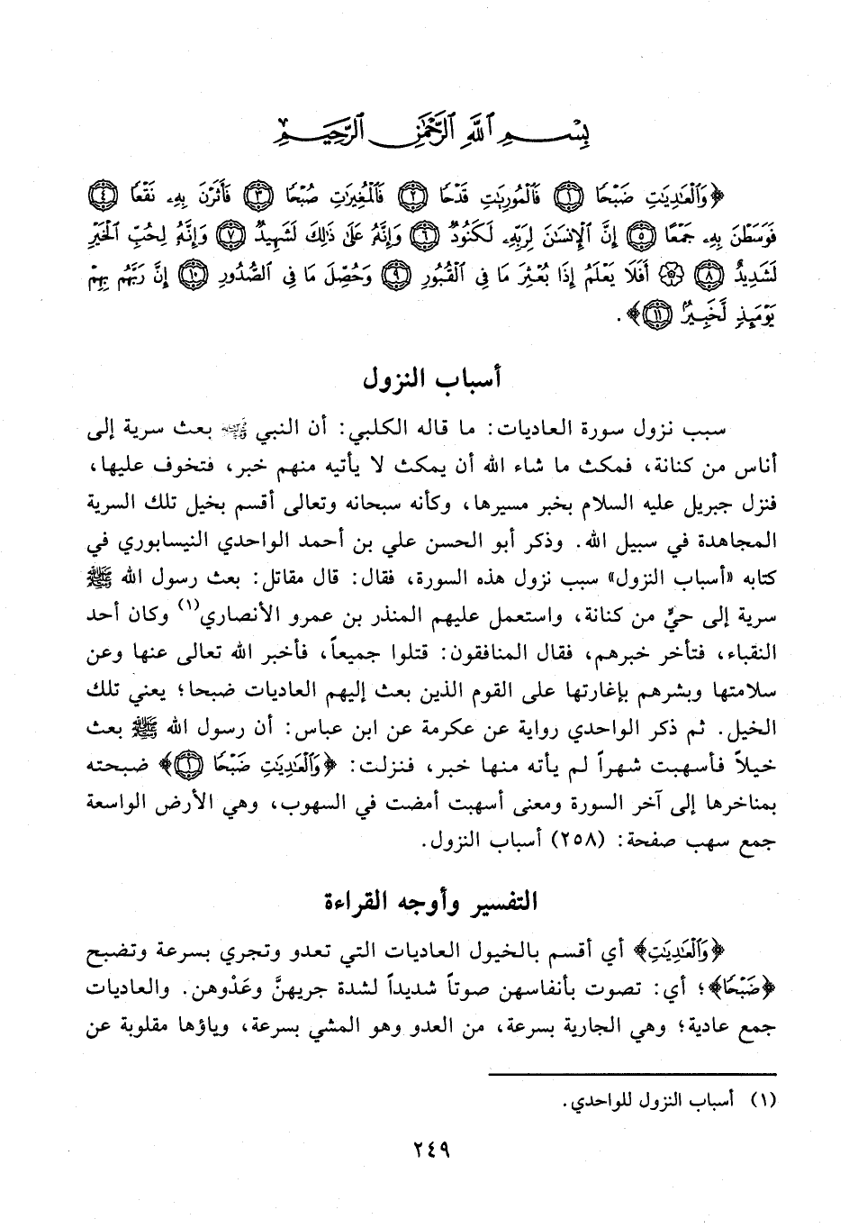 سبب نزول سورة العاديات: ما قاله الكلبي: أن النبي - صلى الله عليه وسلم - بعث سرية إلى أناس من كنانة، فمكث ما شاء الله أن يمكث لا يأتيه منهم خبر، فتخوف عليها، فنزل جبريل عليه السلام بخبر مسيرها، وكأنه سبحانه وتعالى أقسم بخيل تلك السرية المجاهدة في سبيل الله. وذكر أبو الحسن علي بن أحمد الواحدي النيسابوري في كتابه "أسباب النزول" سبب نزول هذه السورة، فقال: قال مقاتل: بعث رسول الله - صلى الله عليه وسلم - سرية إلى حيٍّ من كنانة، واستعمل عليهم المنذر بن عمرو الأنصاري (¬1) وكان أحد النقباء، فتأخر خبرهم، فقال المنافقون: قتلوا جميعًا، فأخبر الله تعالى عنها وعن سلامتها وبشرهم بإغارتها على القوم الذين بعث إليهم العاديات ضبحا؛ يعني تلك الخيل. ثم ذكر الواحدي رواية عن عكرمة عن ابن عباس: أن رسول الله - صلى الله عليه وسلم - بعث خيلًا فأسهبت شهرًا لم يأته منها خبر، فنزلت: {وَالْعَادِيَاتِ ضَبْحًا (1)} ضبحته بمناخرها إلى آخر السورة ومعنى أسهبت أمضت في السهوب، وهي الأرض الواسعة جمع سهب صفحة: (258) أسباب النزول.