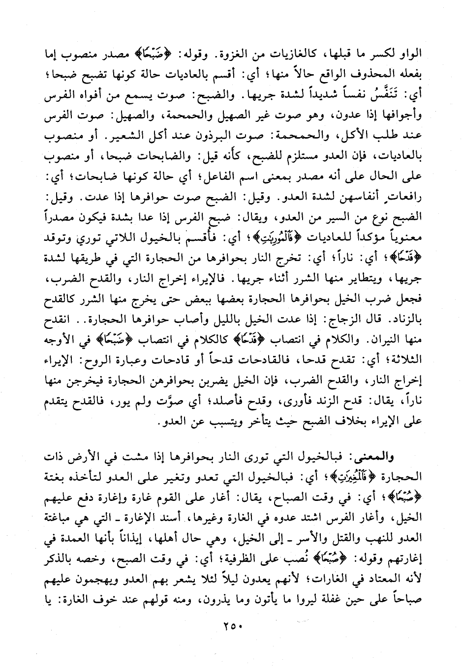 الواو لكسر ما قبلها، كالغازيات من الغزوة. وقوله: {ضَبْحًا} مصدر منصوب إما بفعله المحذوف الواقع حالًا منها؛ أي: أقسم بالعاديات حالة كونها تضبح ضبحا؛ أي: تَنَفَّسُ نفسًا شديدًا لشدة جريها. والضبح: صوت يسمع من أفواه الفرس وأجوافها إذا عدون، وهو صوت غير الصهيل والحمحمة، والصهيل: صوت الفرس عند طلب الأكل، والحمحمة: صوت البرذون عند أكل الشعير. أو منصوب بالعاديات، فإن العدو مستلزم للضبح، كأنه قيل: والضابحات ضبحا، أو منصوب على الحال على أنه مصدر بمعنى اسم الفاعل؛ أي حالة كونها ضابحات؛ أي: رافعاتٍ أنفاسهن لشدة العدو. وقيل: الضبح صوت حوافرها إذا عدت. وقيل: الضبح نوع من السير من العدو، ويقال: ضبح الفرس إذا عدا بشدة فيكون مصدرًا معنويًا مؤكدًا للعاديات