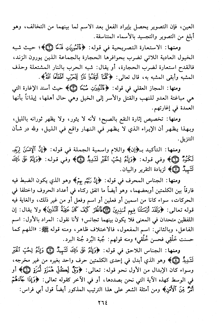 ومنها: المجاز العقلي في قوله: {فَالْمُغِيرَاتِ صُبْحًا (3)} حيث أسند الإغارة التي هي مباغتة العدو للنهب والقتل والأسر إلى الخيل وهي حال أهلها، إيذانًا بأنها العمدة في إغارتهم.
