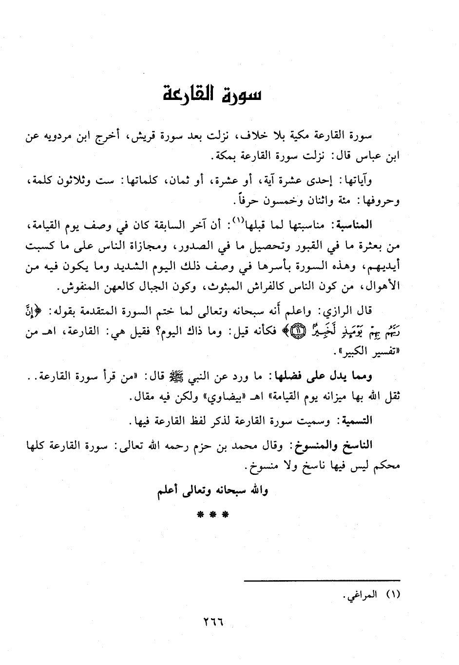 الناسخ والمنسوخ: وقال محمد بن حزم رحمه الله تعالى: سورة القارعة كلها محكم ليس فيها ناسخ ولا منسوخ.