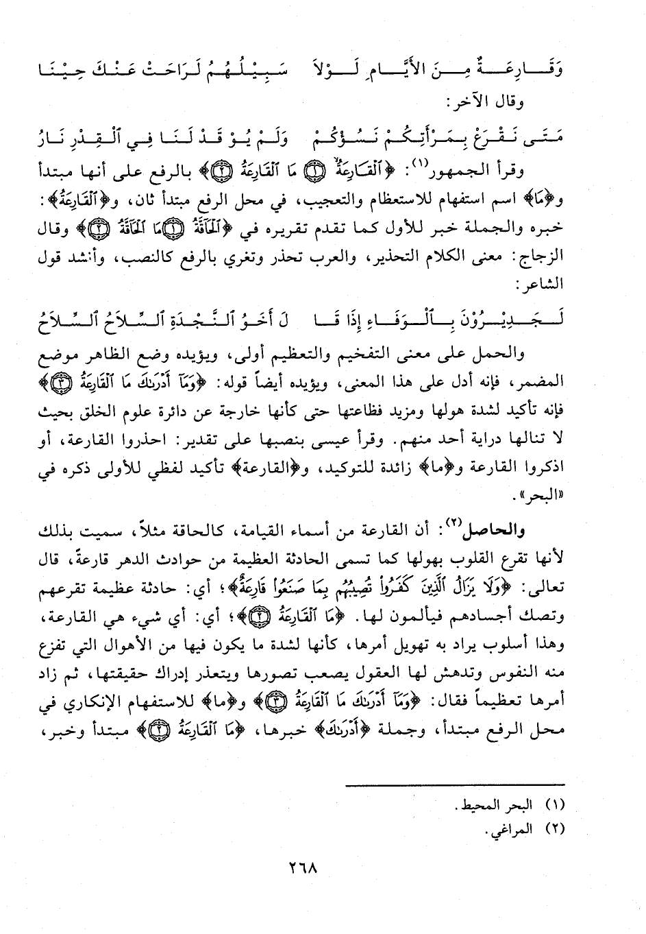 وقرأ الجمهور (¬1): {الْقَارِعَةُ (1) مَا الْقَارِعَةُ (2)} بالرفع على أنها مبتدأ و {مَا} اسم استفهام للاستعظام والتعجيب، في محل الرفع مبتدأ ثان، و {الْقَارِعَةُ}: خبره والجملة خبر للأول كما تقدم تقريره في {الْحَاقَّةُ (1) مَا الْحَاقَّةُ (2)} وقال الزجاج: معنى الكلام التحذير، والعرب تحذر وتغري بالرفع كالنصب، وأنشد قول الشاعر: