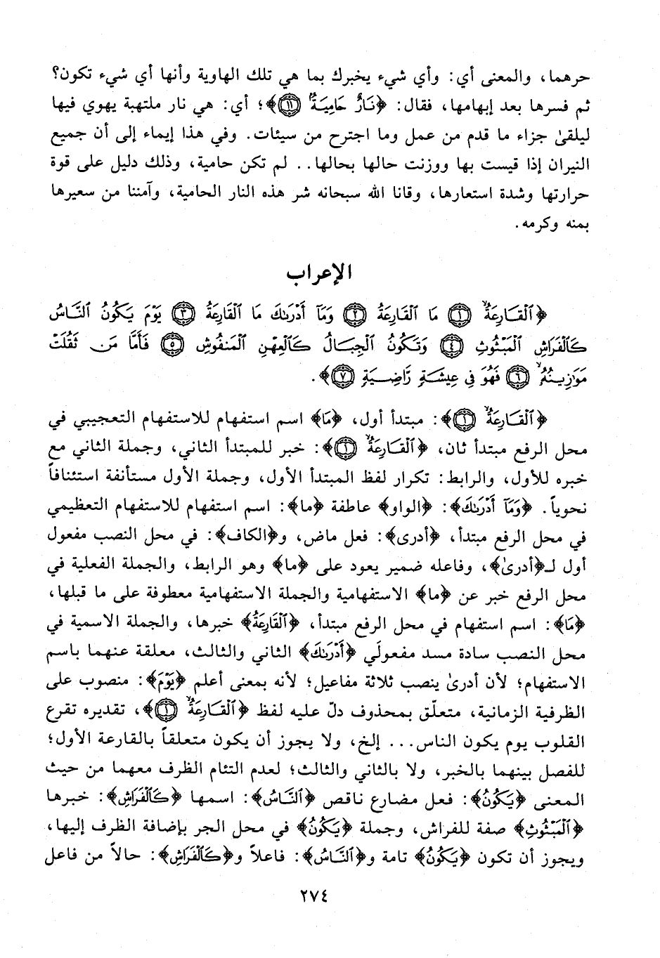 {الْقَارِعَةُ (1)}: مبتدأ أول، {مَا} اسم استفهام للاستفهام التعجيبي في محل الرفع مبتدأ ثان، {الْقَارِعَةُ (1)}: خبر للمبتدأ الثاني، وجملة الثاني مع خبره للأول، والرابط: تكرار لفظ المبتدأ الأول، وجملة الأول مستأنفة استئنافًا نحويًا. {وَمَا أَدْرَاكَ}: {الواو} عاطفة {ما}: اسم استفهام للاستفهام التعظيمي في محل الرفع مبتدأ، {أدرى}: فعل ماض، و {الكاف}: في محل النصب مفعول أول لـ {أدرى}، وفاعله ضمير يعود على {ما} وهو الرابط، والجملة الفعلية في محل الرفع خبر عن {ما} الاستفهامية والجملة الاستفهامية معطوفة على ما قبلها، {مَا}: اسم استفهام في محل الرفع مبتدأ، {الْقَارِعَةُ (1)} خبرها، والجملة الاسمية في محل النصب سادة مسد مفعولَي {أَدْرَاكَ} الثاني والثالث، معلقة عنهما باسم الاستفهام؛ لأن أدرى ينصب ثلاثة مفاعيل؛ لأنه بمعنى أعلم {يَوْمَ}: منصوب على الظرفية الزمانية، متعلّق بمحذوف دلّ عليه لفظ {الْقَارِعَةُ (1)}، تقديره تقرع القلوب يوم يكون الناس ... إلخ، ولا يجوز أن يكون متعلقًا بالقارعة الأول؛ اللفصل بينهما بالخبر، ولا بالثاني والثالث؛ لعدم التئام الظرف معهما من حيث المعنى {يَكُونُ}: فعل مضارع ناقص {النَّاسُ}: اسمها {كَالْفَرَاشِ}: خبرها {الْمَبْثُوثِ} صفة للفراش، وجملة {يَكُونُ} في محل الجر بإضافة الظرف إليها، ويجوز أن تكون {يَكُونُ} تامة و {النَّاسُ}: فاعلًا و {كَالْفَرَاشِ}: حالًا من فاعل
