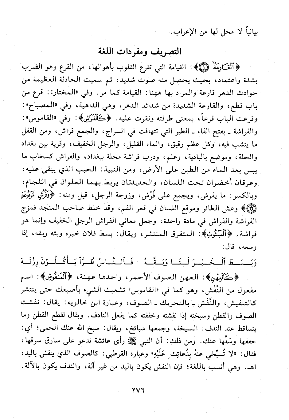 {الْقَارِعَةُ (1)}: القيامة التي تقرع القلوب بأهوالها، من القرع وهو الضرب بشدة واعتماد، بحيث يحصل منه صوت شديد، ثم سميت الحادثة العظيمة من حوادث الدهر قارعة والمراد بها هاهنا: القيامة كما مر. وفي "المختار": قرع من باب قطع، والقارعة الشديدة من شدائد الدهر، وهي الداهية، وفي "المصباح": وقرعت الباب قرعًا، بمعنى طرقته ونقرت عليه. {كَالْفَرَاشِ}: وفي "القاموس": والفراشة - بفتح الفاء - الطير التي تتهافت في السراج، والجمع فراش، ومن القفل ما ينشب فيه، وكل عظم رقيق، والماء القليل، والرجل الخفيف، وقرية بين بغداد والحلة، وموضع بالبادية، وعلم، ودرب فراشة محلة ببغداد، والفراش كسحاب ما يبس بعد الماء من الطين على الأرض، ومن النبيذ: الحبب الذي يبقى عليه، وعرقان أخضران تحت اللسان، والحديدتان يربط بهما العلوان في اللجام، وبالكسر: ما يفرش، ويجمع على فُرُش، وزوجة الرجل، قيل ومنه: {وَفُرُشٍ مَرْفُوعَةٍ (34)} وعش الطائر وموقع اللسان في قعر الفم، وقد خلط صاحب المنجد فمزج الفراشة والفراش في مادة واحدة، وجعل معاني الفراش الرجل الخفيف وإنما هو فراشة. {الْمَبْثُوثِ} المتفرق المنتشر، ويقال: بسط فلان خبره وبثه وبقه، إذا وسعه، قال.