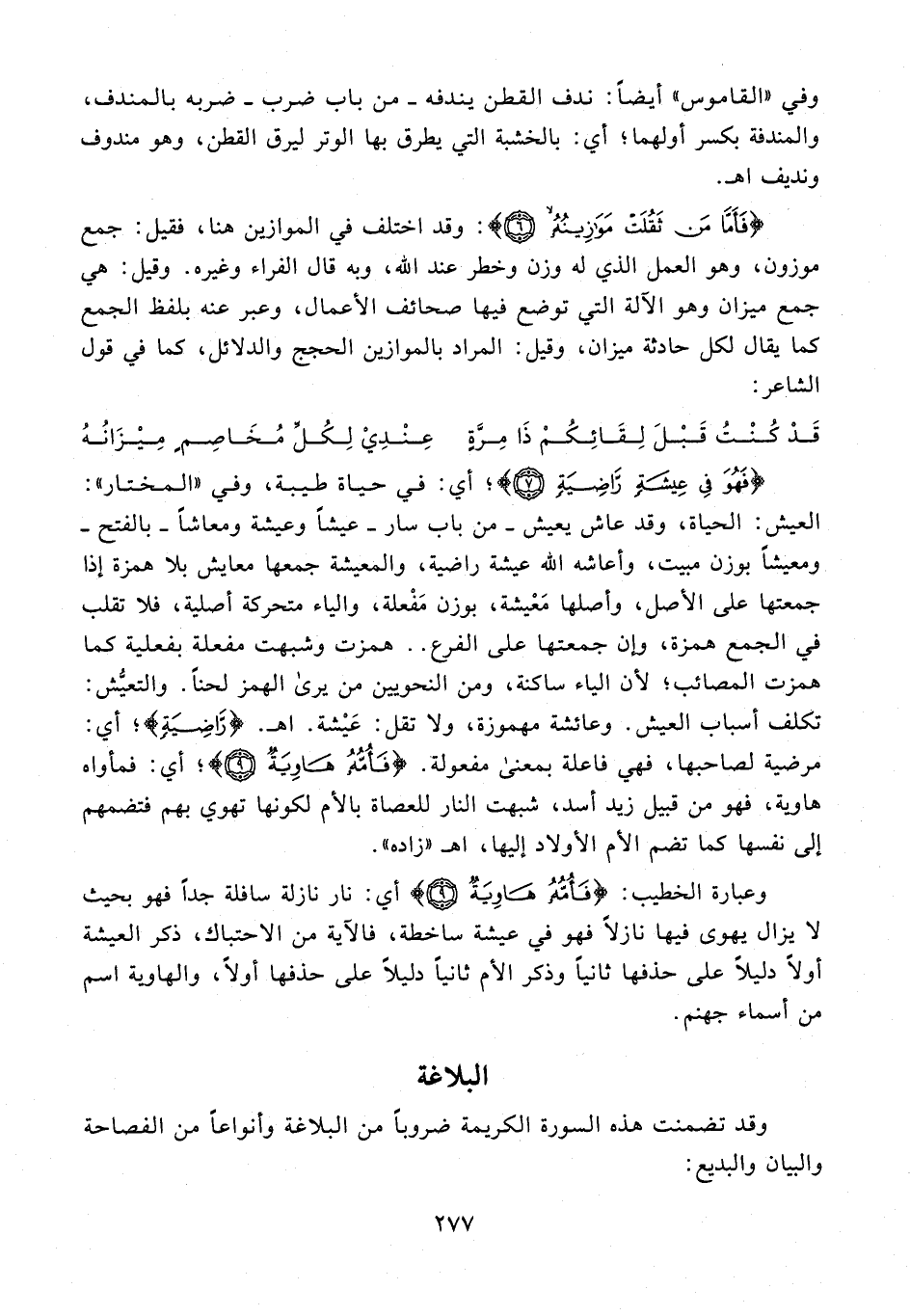 {فَأَمَّا مَنْ ثَقُلَتْ مَوَازِينُهُ (6)}: وقد اختلف في الموازين هنا، فقيل: جمع موزون، وهو العمل الذي له وزن وخطر عند الله، وبه قال الفراء وغيره. وقيل: هي جمع ميزان وهو الآلة التي توضع فيها صحائف الأعمال، وعبر عنه بلفظ الجمع كما يقال لكل حادثة ميزان، وقيل: المراد بالموازين الحجج و"الدلائل" كما في قول الشاعر:
