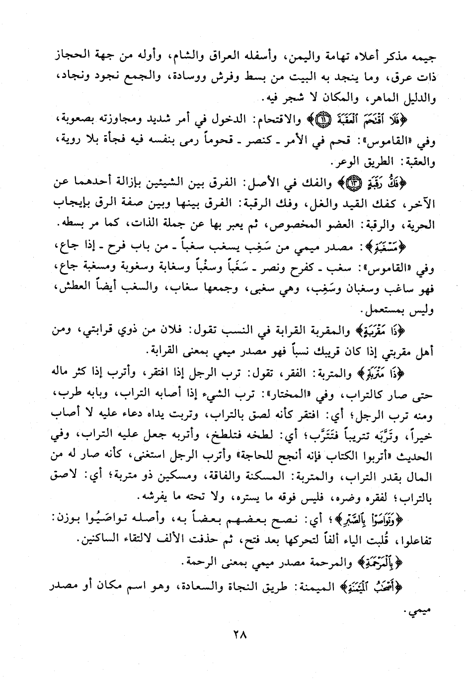 {فَكُّ رَقَبَةٍ (13)} والفك في الأصل: الفرق بين الشيئين بإزالة أحدهما عن الاخر، كفك القيد والغل، وفك الرقبة: الفرق بينها وبين صفة الرق بإيجاب الحرية، والرقبة: العضو المخصوص، ثم يعبر بها عن جملة الذات، كا مر بسطه.