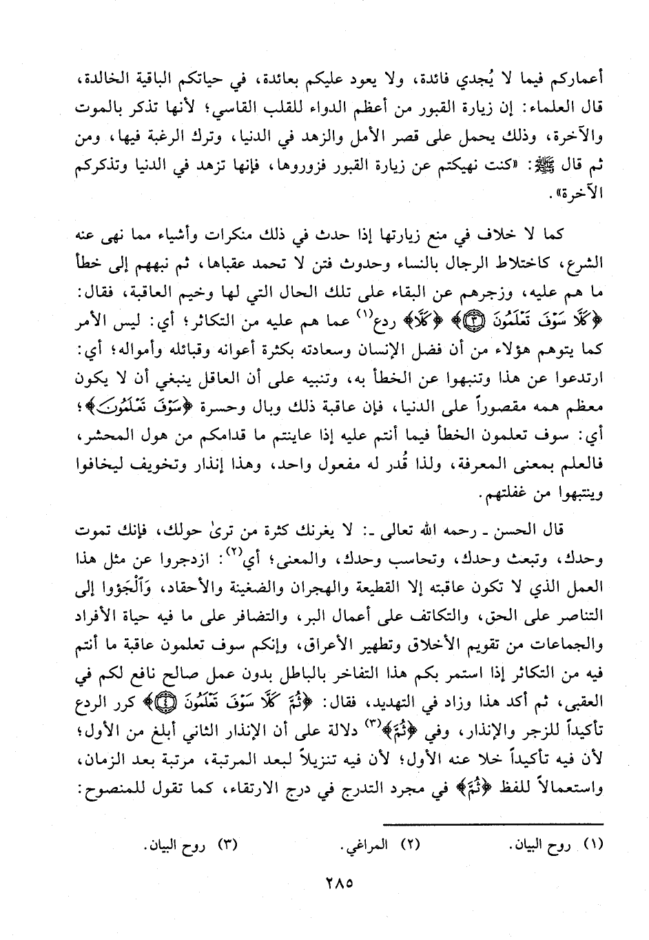 قال الحسن - رحمه الله تعالى -: لا يغرنك كثرة من ترى حولك، فإنك تموت وحدك، وتبعث وحدك، وتحاسب وحدك، والمعنى؛ أي (¬2): ازدجروا عن مثل هذا العمل الذي لا تكون عاقبته إلا القطيعة والهجران والضغينة والأحقاد، وَالْجَؤوا إلى التناصر على الحق، والتكاتف على أعمال البر، والتضافر على ما فيه حياة الأفراد والجماعات من تقويم الأخلاق وتطهير الأعراق، وإنكم سوف تعلمون عاقبة ما أنتم فيه من التكاثر إذا استمر بكم هذا التفاخر بالباطل بدون عمل صالح نافع لكم في العقبى،