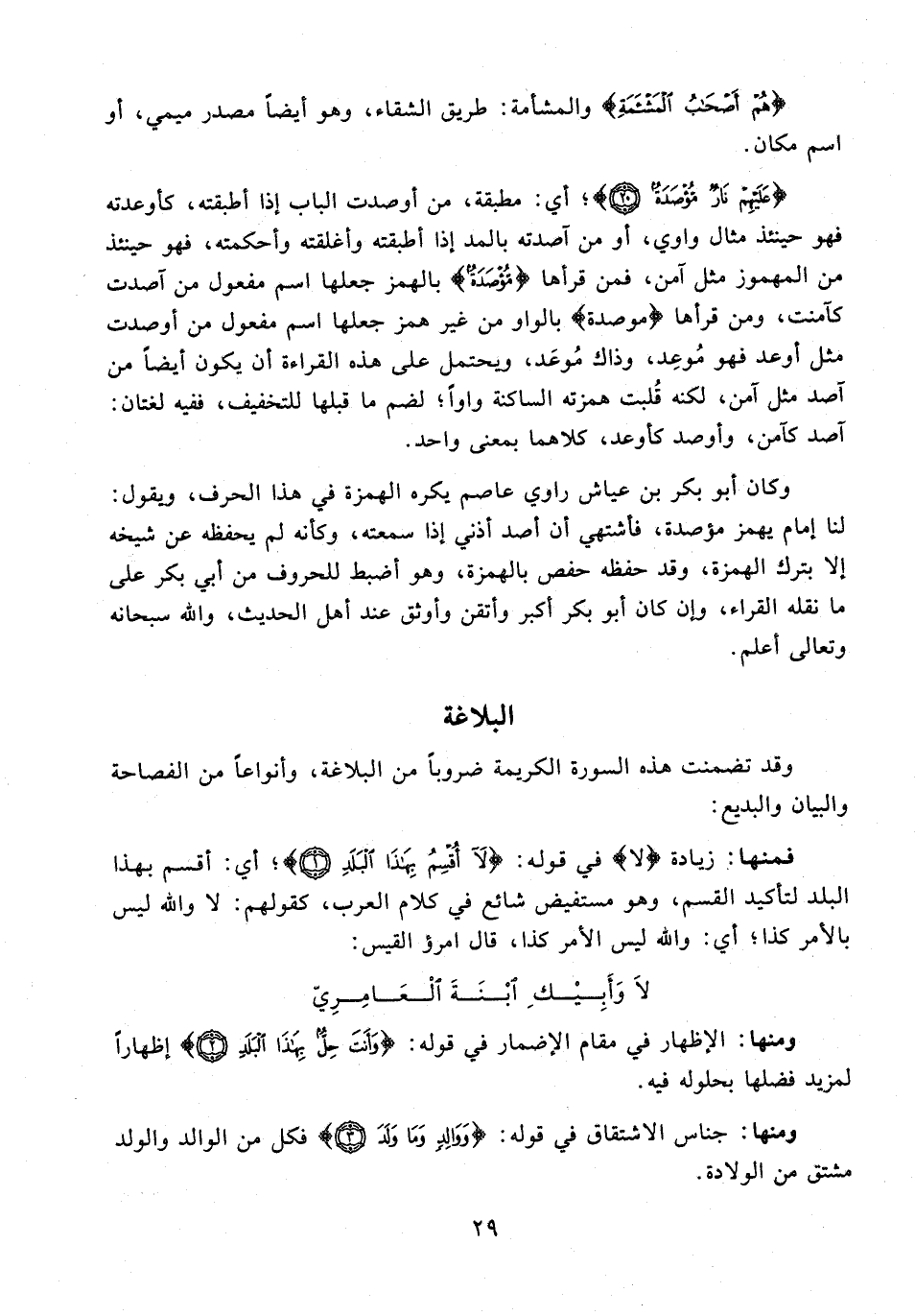 فمنها: زيادة {لا} في قوله: {لَا أُقْسِمُ بِهَذَا الْبَلَدِ (1)}؛ أي: أقحم بهذا البلد لتكيد القسم، وهو مستفيض شائع في كلام العرب، كقولهم: لا والله ليس بالأمر كذا؛ أي: والله ليس الأمر كذا، قال امرؤ القيس: