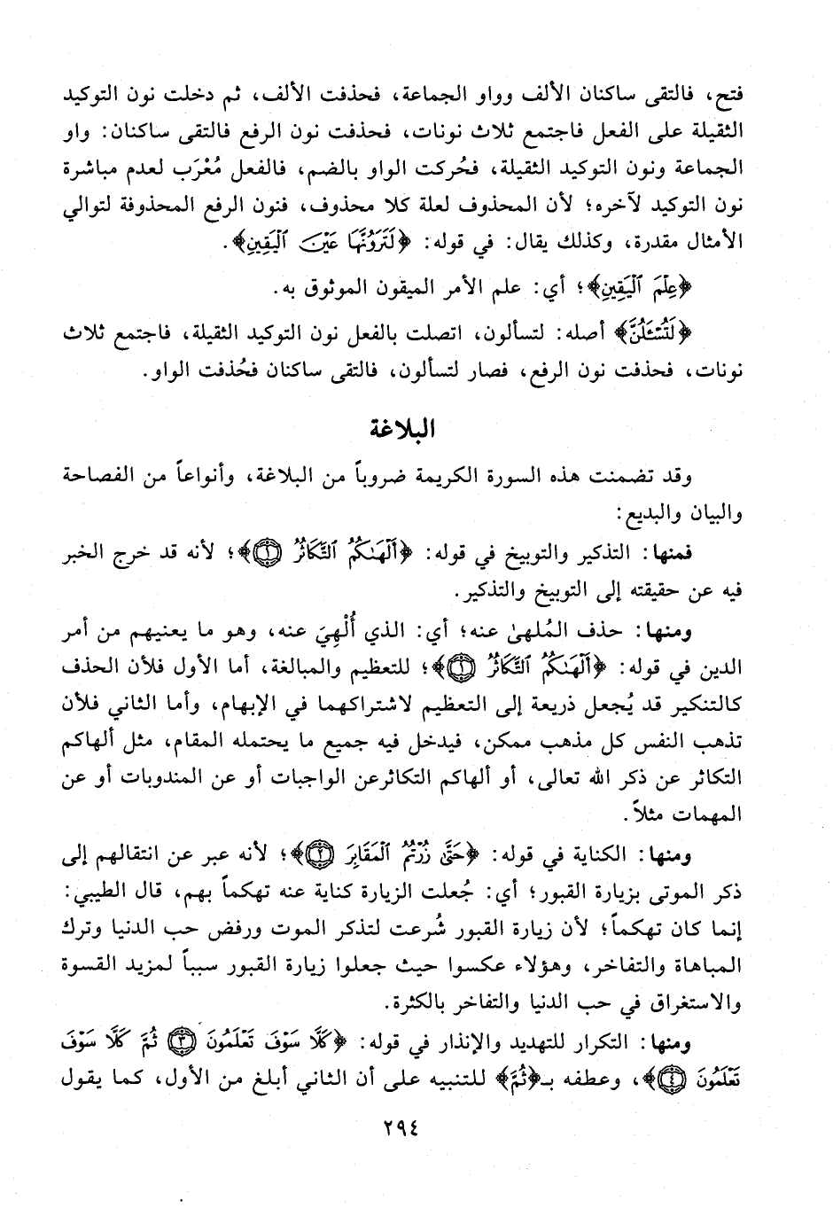 ومنها: حذف المُلهى عنه؛ أي: الذي أُلْهِيَ عنه، وهو ما يعنيهم من أمر الدين في قوله: {أَلْهَاكُمُ التَّكَاثُرُ (1)}؛ للتعظيم والمبالغة، أما الأول فلأن الحذف كالتنكير قد يُجعل ذريعة إلى التعظيم لاشتراكهما في الإبهام، وأما الثاني فلأن تذهب النفس كل مذهب ممكن، فيدخل فيه جميع ما يحتمله المقام، مثل ألهاكم التكاثر عن ذكر الله تعالى، من ألهاكم التكاثر عن الواجبات أو عن المندوبات أو عن المهمات مثلًا.