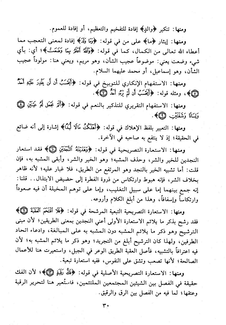 ومنها: الاستعارة التصريحية في قوله: {وَهَدَيْنَاهُ النَّجْدَيْنِ (10)} فقد استعار النجدين للخير والشر، وحذف المشبه؛ وهو الخير والشر، وأبقى المشبه به، فإن قلت: أما تشبيه الخير بالنجد وهو المرتفع من الطريق، فلا غبار عليه؛ لأنه ظاهر بخلاف الشر، فإنه هبوط وارتكاس من ذروة الفطرة إلى حضيض الابتذال .. قلنا: إنه جمع بينهما إما على سبيل التغليب، وإما على توهم المخيلة أن فيه صعودًا وارتكاسًا وإسفافًا، وهذا من أبلغ الكلام وأروعه.