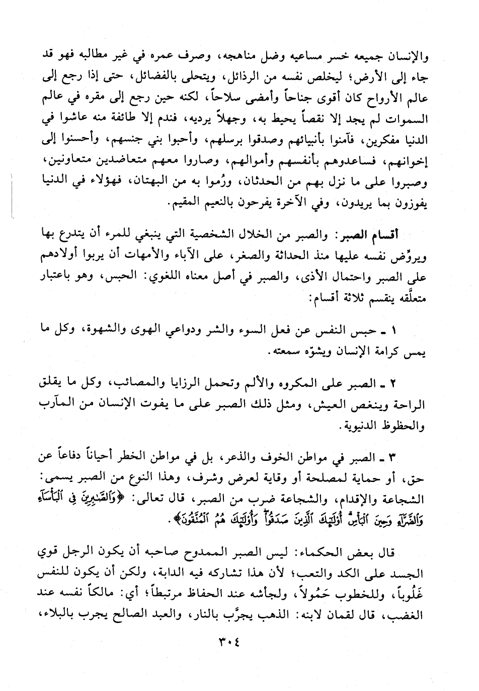 3 - الصبر في مواطن الخوف والذعر، بل في مواطن الخطر أحيانًا دفاعًا عن حق، من حماية لمصلحة أو وقاية لعرض وشرف، وهذا النوع من الصبر يسمى: الشجاعة والإقدام، والشجاعة ضرب من الصبر، قال تعالى: {وَالصَّابِرِينَ فِي الْبَأْسَاءِ وَالضَّرَّاءِ وَحِينَ الْبَأْسِ أُولَئِكَ الَّذِينَ صَدَقُوا وَأُولَئِكَ هُمُ الْمُتَّقُونَ}.