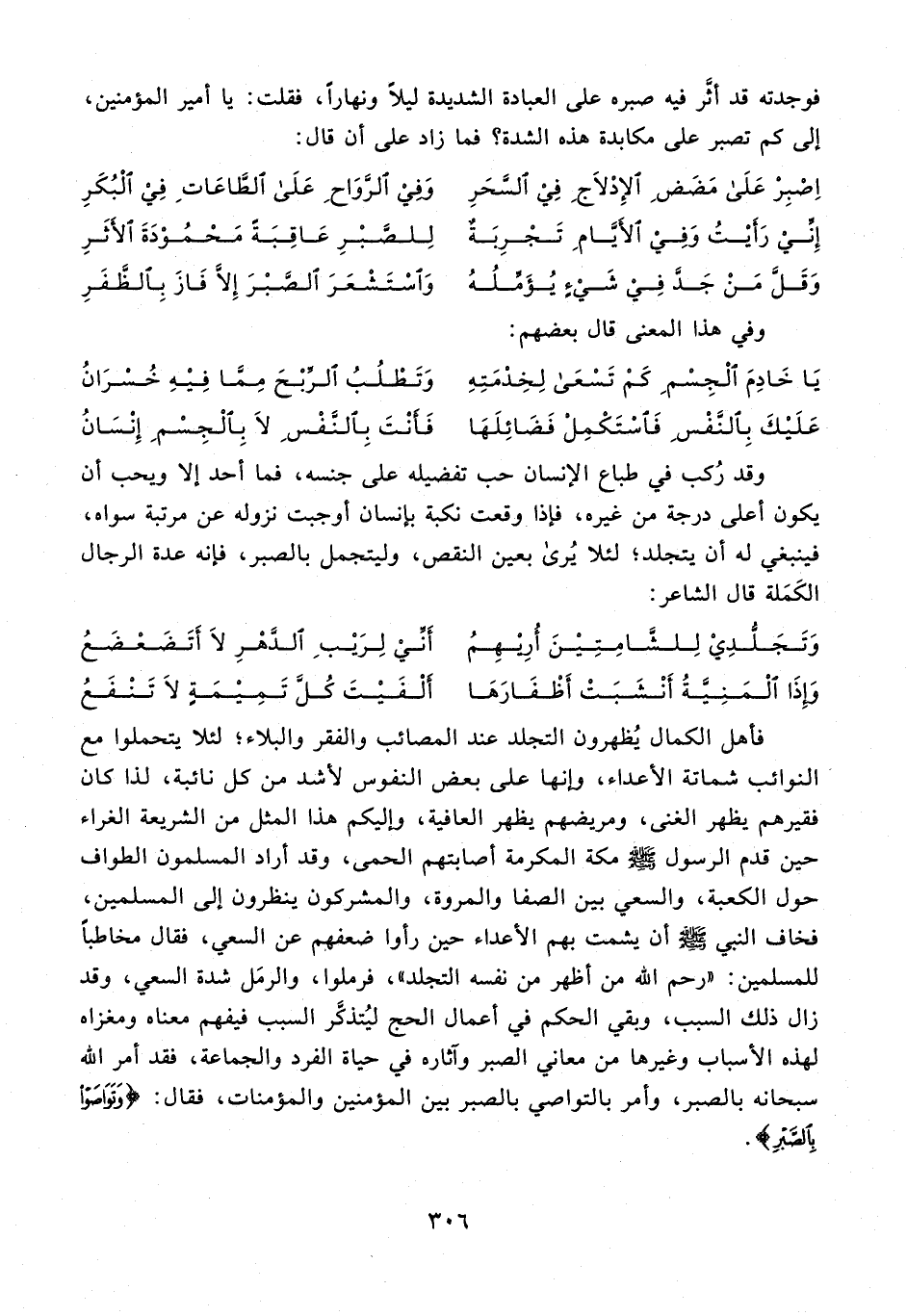 فأهل الكمال يُظهرون التجلد عند المصائب والفقر والبلاء؛ لئلا يتحملوا مع النوائب شماتة الأعداء، وإنها على بعض النفوس لأشد من كل نائبة، لذا كان فقيرهم يظهر الغنى، ومريضهم يظهر العافية، وإليكم هذا المثل من الشريعة الغراء حين قدم الرسول - صلى الله عليه وسلم - مكة المكرمة أصابتهم الحمى، وقد أراد المسلمون الطواف حول الكعبة، والسعي بين الصفا والمروة، والمشركون ينظرون إلى المسلمين، فخاف النبي - صلى الله عليه وسلم - أن يشمت بهم الأعداء حين رأوا ضعفهم عن السعي، فقال مخاطبًا للمسلمين: "رحم الله من أظهر من نفسه التجلد"، فرملوا، والرمَل شدة السعي، وقد زال ذلك السبب، وبقي الحكم في أعمال الحج ليُتذكَّر السبب فيفهم معناه ومغزاه لهذه الأسباب وغيرها من معاني الصبر وآثاره في حياة الفرد والجماعة، فقد أمر الله سبحانه بالصبر، وأمر بالتواصي بالصبر بين المؤمنين والمؤمنات، فقال: {وَتَوَاصَوْا بِالصَّبْرِ}.
