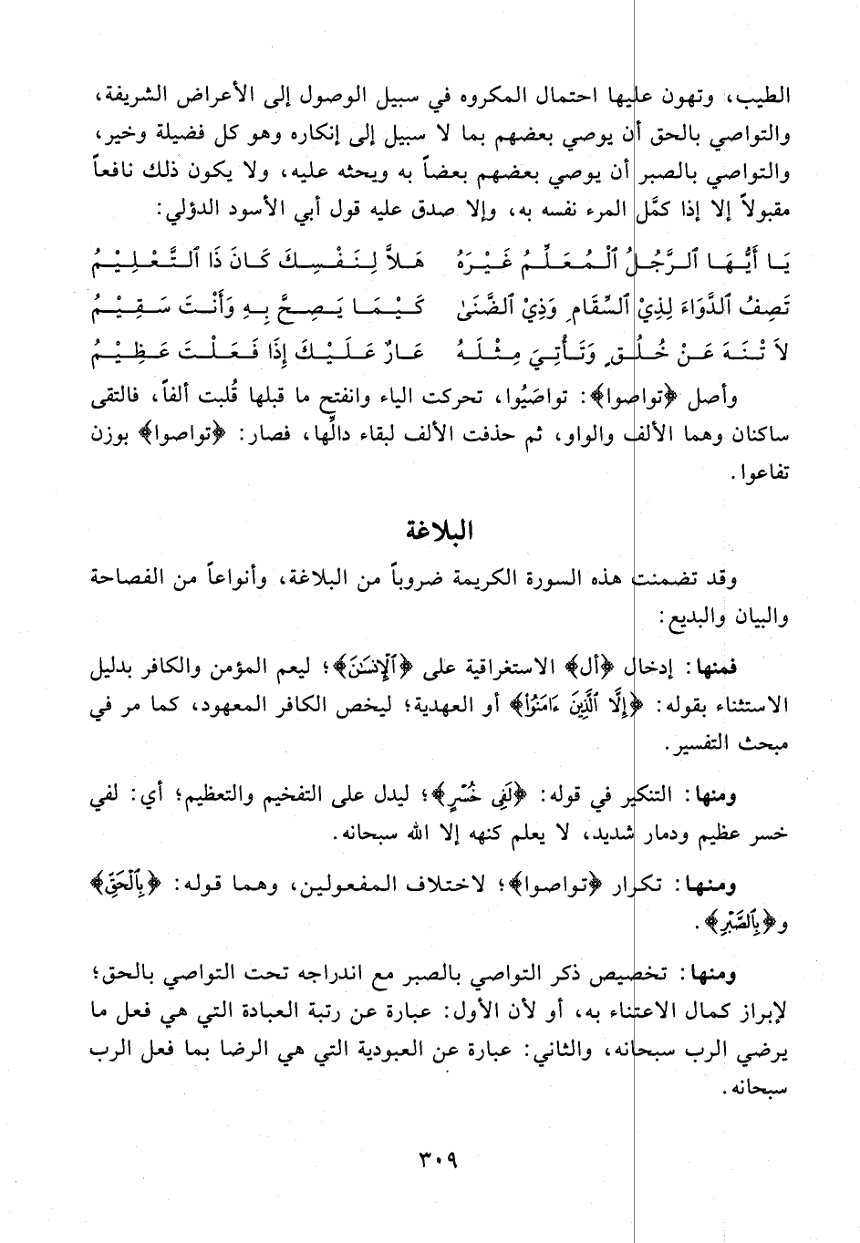 الطيب، وتهون عليها احتمال المكروه في سبيل الوصول إلى الأعراض الشريفة، والتواصى بالحق أن يوصي بعضهم بما لا سبيل إلى إنكاره وهو كل فضيلة وخير، والتواصي بالصبر أن يوصي بعضهم بعضًا به ويحثه عليه، ولا يكون ذلك نافعًا مقبولًا إلا إذا كمَّل للمرء نفسه به، وإلا صدق عليه قول أبي الأسود الدؤلي: