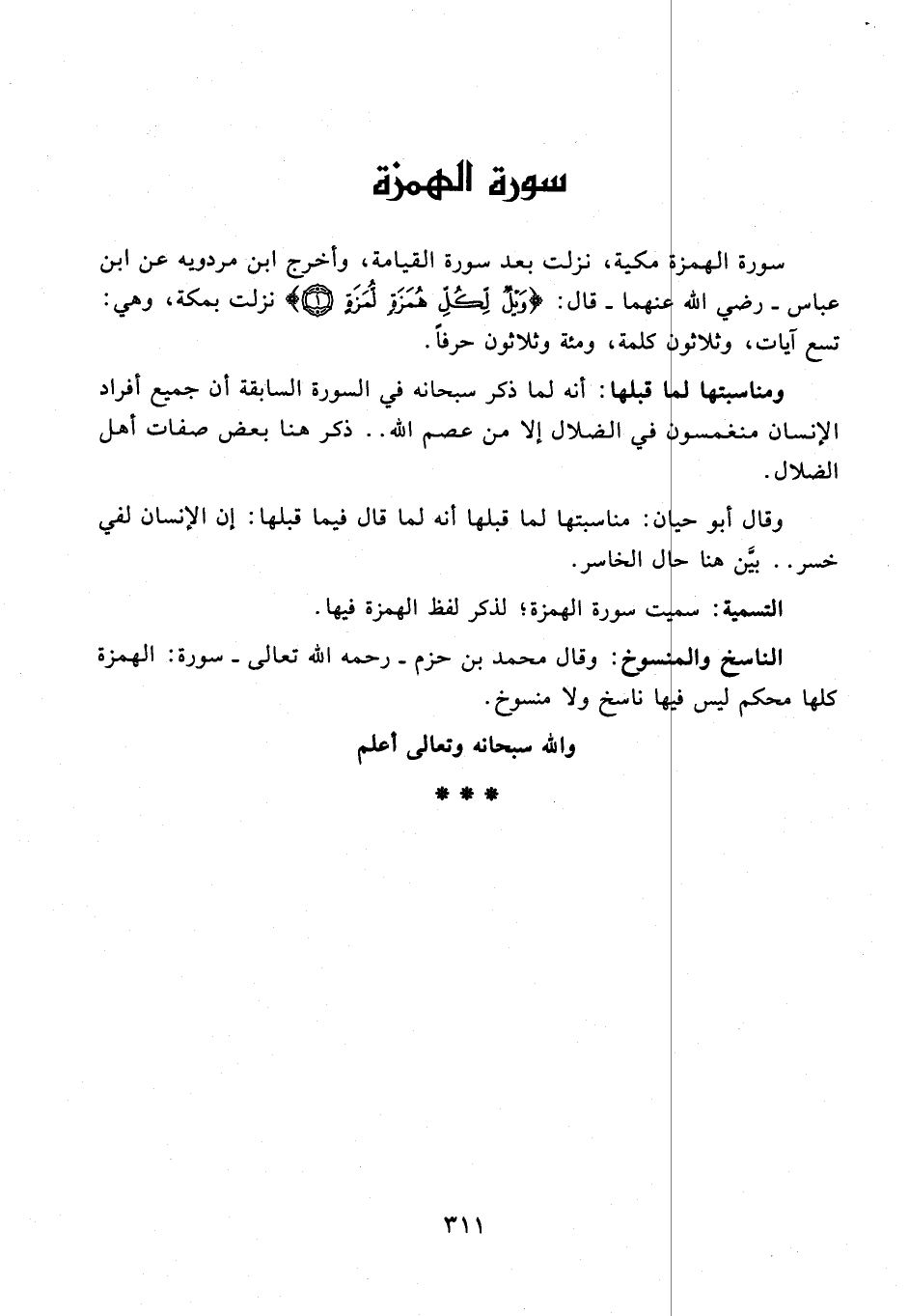 الناسخ والمنسوخ: وقال محمد بن حزم - رحمه الله تعالى - سورة: الهمزة كلها محكم ليس فيها ناسخ ولا منسوخ.