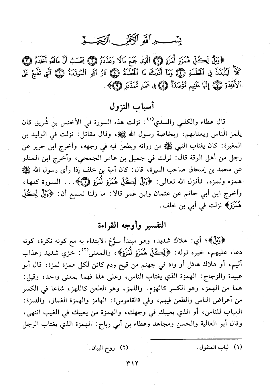 {وَيْلٌ لِكُلِّ هُمَزَةٍ لُمَزَةٍ (1) الَّذِي جَمَعَ مَالًا وَعَدَّدَهُ (2) يَحْسَبُ أَنَّ مَالَهُ أَخْلَدَهُ (3) كَلَّا لَيُنْبَذَنَّ فِي الْحُطَمَةِ (4) وَمَا أَدْرَاكَ مَا الْحُطَمَةُ (5) نَارُ اللَّهِ الْمُوقَدَةُ (6) الَّتِي تَطَّلِعُ عَلَى الْأَفْئِدَةِ (7) إِنَّهَا عَلَيْهِمْ مُؤْصَدَةٌ (8) فِي عَمَدٍ مُمَدَّدَةٍ (9)}.