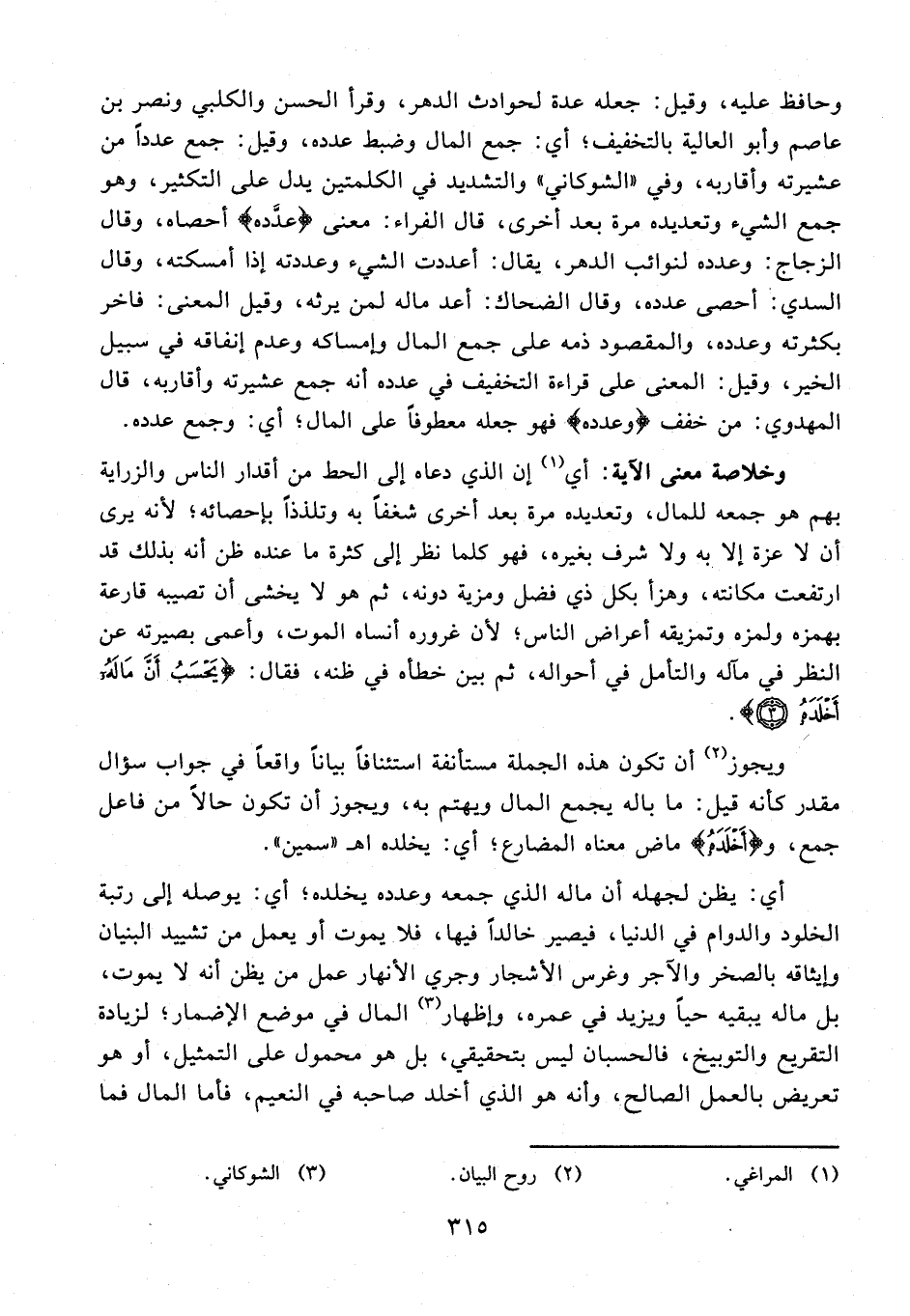 وخلاصة معنى النيابة: أي (¬1) إن الذي دعاه إلى الحط من أقدار الناس والزراية بهم هو جمعه للمال، وتعديده مرة بعد أخرى شغفًا به وتلذذًا بإحصائه؛ لأنه يرى أن لا عزة إلا به ولا شرف بغيره، فهو كلما نظر إلى كثرة ما عنده ظن أنه بذلك قد ارتفعت مكانته، وهزأ بكل ذي فضل ومزية دونه، ثم هو لا يخشى أن تصيبه قارعة بهمزه ولمزه وتمزيقه أعراض الناس؛ لأن غروره أنساه الموت، وأعمى بصيرته عن النظر في مآله والتأمل في أحواله،