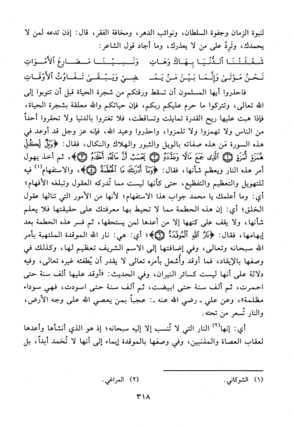 6 - ثم فسر هذه الحطمة بعد إبهامها، فقال: {نَارُ اللَّهِ الْمُوقَدَةُ (6)}؛ أي: هي: نار الله الموقدة الملتهبة بأمر الله سبحانه وتعالى، وفي إضافتها إلى الاسم الشريف تعظيم لها، وكذلك في وصفها بالإيقاد، فما أوقد وأُشعل بأمره تعالى لا يقدر أن يُطفئه غيره تعالى، وفيه دلالة على أنها ليست كسائر النيران، وفي الحديث: "أوقد عليها ألف سنة حتى احمرت، ثم ألف سنة حتى ابيضت، ثم ألف سنة حتى اسودت، فهي سوداء مظلمة"، وعن علي - رضي الله عنه -: عجبًا بمن يعصي الله على وجه الأرض، والنار تُسعر من تحته.