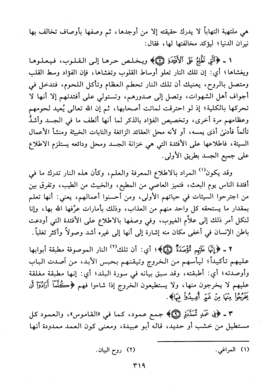 1 - {الَّتِي تَطَّلِعُ عَلَى الْأَفْئِدَةِ (7)} ويخلص حرها إلى القلوب، فيعلوها ويغشاها؛ أي: إن تلك النار تعلو أوساط القلوب وتغشاها، فإن الفؤاد وسط القلب ومتصل بالروح، يعنيك أن تلك النار تحطم العظام وتأكل اللحوم، فتدخل في أجواف أهل الشهوات، وتصل إلى صدورهم، وتستولي على أفئدتهم إلا أنها لا تحركها بالكلية؛ إذ لو احترقت لماتت أصحابها، ثم إن الله تعالى يُعيد لحومهم وعظامهم مرة أخرى، وتخصيص الفؤاد بالذكر لما أنها ألطف ما في الجسد وأشدُّ تألمًا فأدنى أذى يمسه، أو لأنه محل العقائد الزائغة والنابات الخبيثة ومنشأ الأعمال السيئة، فاطلاعها على الأفئدة التي هي خزانة الجسد ومحل ودائعه يستلزم الاطلاع على جميع الجسد بطريق الأولى.