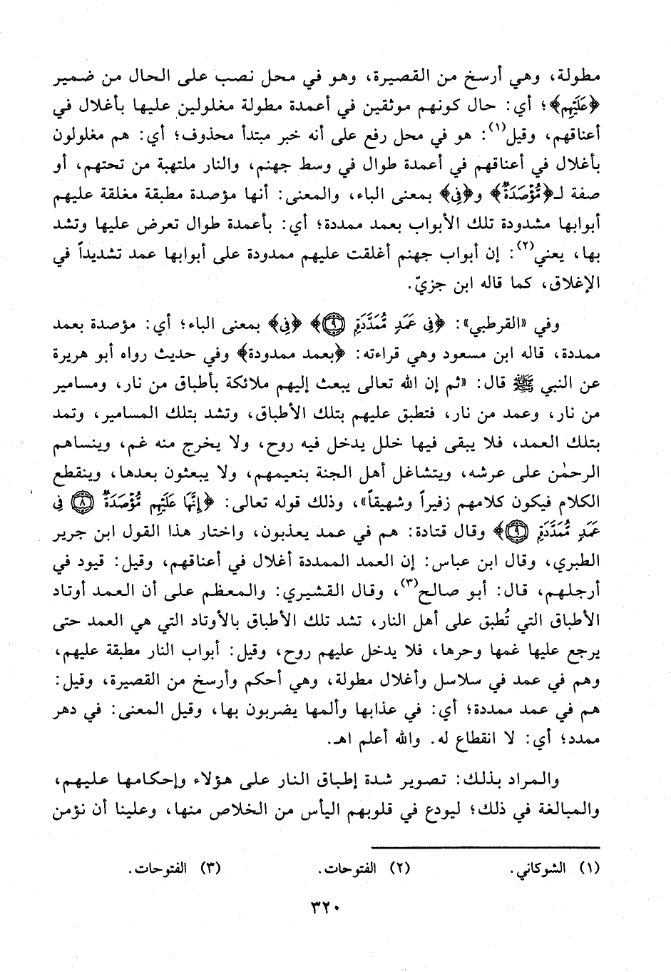 أرجلهم، قال: أبو صالح (¬3)، وقال القشيري: والمعظم على أن العمد أوتاد الأطباق التي تُطبق على أهل النار، تشد تلك الأطباق بالأوتاد التي هي العمد حتى يرجع عليها غمها وحرها، فلا يدخل عليهم روح، وقيل: أبواب النار مطبقة عليهم، وهم في عمد في سلاسل وأغلال مطولة، وهي أحكم وأرسخ من القصيرة، وقيل: هم في عمد ممددة؛ أي: في عذابها وألمها يضربون بها، وقيل المعنى: في دهر ممدد؛ أي: لا انقطاع له. والله أعلم اهـ.