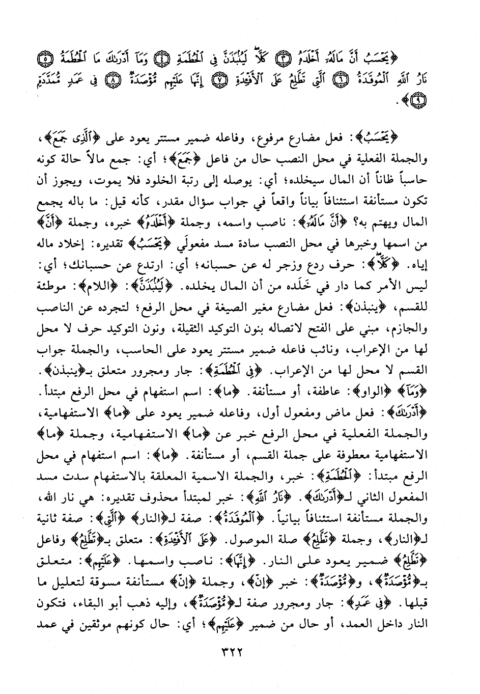 {يَحْسَبُ}: فعل مضارع مرفوع، وفاعله ضمير مستتر يعود على {الَّذِي جَمَعَ}، والجملة الفعلية في محل النصب حال من فاعل {جَمَعَ}؛ أي: جمع مالًا حالة كونه حاسبًا ظانًا أن المال سيخلده؛ أي: يوصله إلى رتبة الخلود فلا يموت، ويجوز أن تكون مستأنفة استئنافًا بيانًا واقعًا في جواب سؤال مقدر، كأنه قيل: ما باله يجمع المال ويهتم به؟ {أَنَّ مَالَهُ}: ناصب واسمه، وجملة {أَخْلَدَهُ} خبره، وجملة {أَنَّ} من اسمها وخبرها في محل النصب سادة مسد مفعولَي {يَحْسَبُ} تقديره: إخلاد ماله إياه. {كَلَّا}: حرف ردع وزجر له عن حسبانه؛ أي: ارتدع عن حسبانك؛ أي: ليس الأمر كما دار في خَلَده من أن المال يخلده. {لَيُنْبَذَنَّ}: {اللام}: موطئة للقسم، {ينبذن}: فعل مضارع مغير الصيغة في محل الرفع؛ لتجرده عن الناصب والجازم، مبني على الفتح لاتصاله بنون التوكيد الثقيلة، ونون التوكيد حرف لا محل لها من الإعراب، ونائب فاعله ضمير مستتر يعود على الحاسب، والجملة جواب القسم لا محل لها من الإعراب. {فِي الْحُطَمَةِ}: جار ومجرور متعلق بـ {ينبذن}. {وَمَا} {الواو}: عاطفة، أو مستأنفة. {ما}: اسم استفهام في محل الرفع مبتدأ. {أَدْرَاكَ}: فعل ماض ومفعول أول، وفاعله ضمير يعود على {ما} الاستفهامية، والجملة الفعلية في محل الرفع خبر عن {ما} الاستفهامية، وجملة {ما} الاستفهامية معطوفة على جملة القسم، أو مستأنفة. {ما}: اسم استفهام في محل الرفع مبتدأ: {الْحُطَمَةِ}: خبر، والجملة الاسمية المعلقة بالاستفهام سدت مسد المفعول الثاني لـ {أَدْرَاكَ}. {نَارُ اللَّهِ}: خبر لمبتدأ محذوف تقديره: هي نار الله، والجملة مستأنفة استئنافًا بيانيًا. {الْمُوقَدَةُ}: صفة لـ {النار} {الَّتِي}: صفة ثانية لـ {النار}، وجملة {تَطَّلِعُ} صلة الموصول. {عَلَى الْأَفْئِدَةِ}: متعلق بـ {تَطَّلِعُ} وفاعل {تَطَّلِعُ} ضمير يعود على النار. {إِنَّهَا}: ناصب واسمها. {عَلَيْهِمْ}: متعلق بـ {مُؤْصَدَةٌ}، و {مُؤْصَدَةٌ}: خبر {إنّ}، وجملة {إنّ} مستأنفة مسوقة لتعليل ما قبلها. {في عَمَدٍ}: جار ومجرور صفة لـ {مُؤْصَدَةٌ}، وإليه ذهب أبو البقاء، فتكون النار داخل العمد، أو حال من ضمير {عَلَيْهِمْ}؛ أي: حال كونهم موثقين في عمد