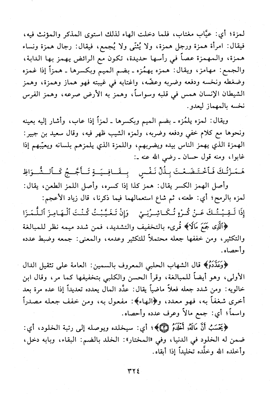 لمزة؛ أي: عيَّاب مغتاب، فلما دخلت الهاء لذلك استوى المذكر والمؤنث فيه، فيقال: امرأة همزة ورجل همزة، ولا يُثنّى ولا يُجمع، فيقال: رجال همزة ونساء همزة، والمهمزة عصًا في رأسها حديدة، تكون مع الرائض يهمز بها الدابة، والجمع: مهامز، ويقال: همزه يهمُزه - بضم الميم وبكسرها - همزًا إذا غمزه وضغطه ونخسه ودفعه وضربه وعضّه، واغتابه في غيبته فهو هماز وهمزة، وهمز الشيطان الإنسان همس في قلبه وسواسًا، وهمز به الأرض صرعه، وهمز الفرس نخسه بالمهماز ليعدو.