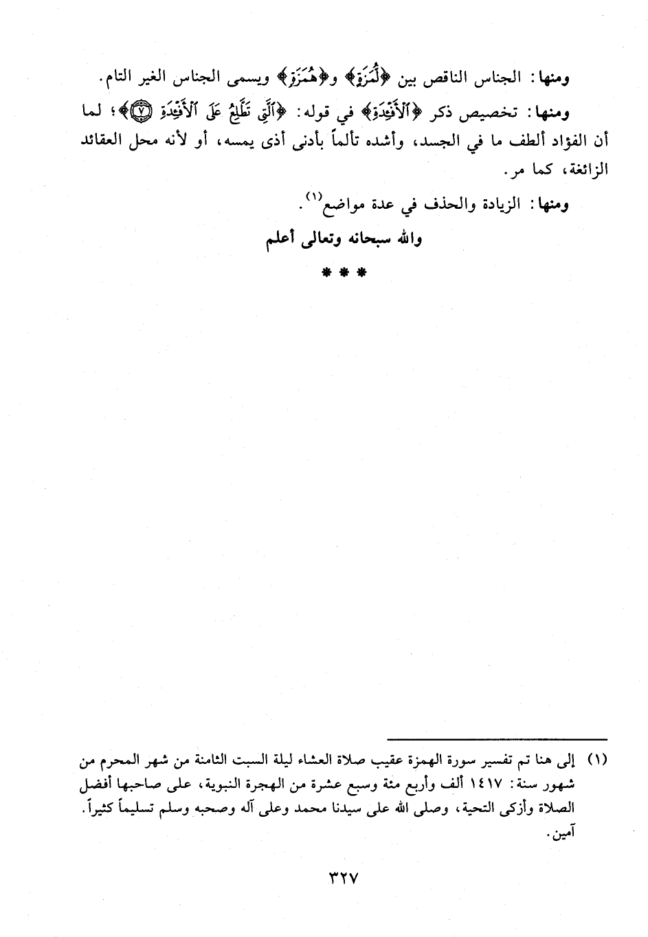 (¬1) إلى هنا تم تفسير سورة الهمزة عقيب صلاة العشاء ليلة السبت الثامنة من شهر المحرم من شهور سنة: 1417 ألف وأربع مئة وسبع عشرة من الهجرة النبوية، على صاحبها أفضل الصلاة وأزكى التحية، وصلى الله على سيدنا محمد وعلى آله وصحبه وسلم تسليمًا كثيرًا. آمين.
