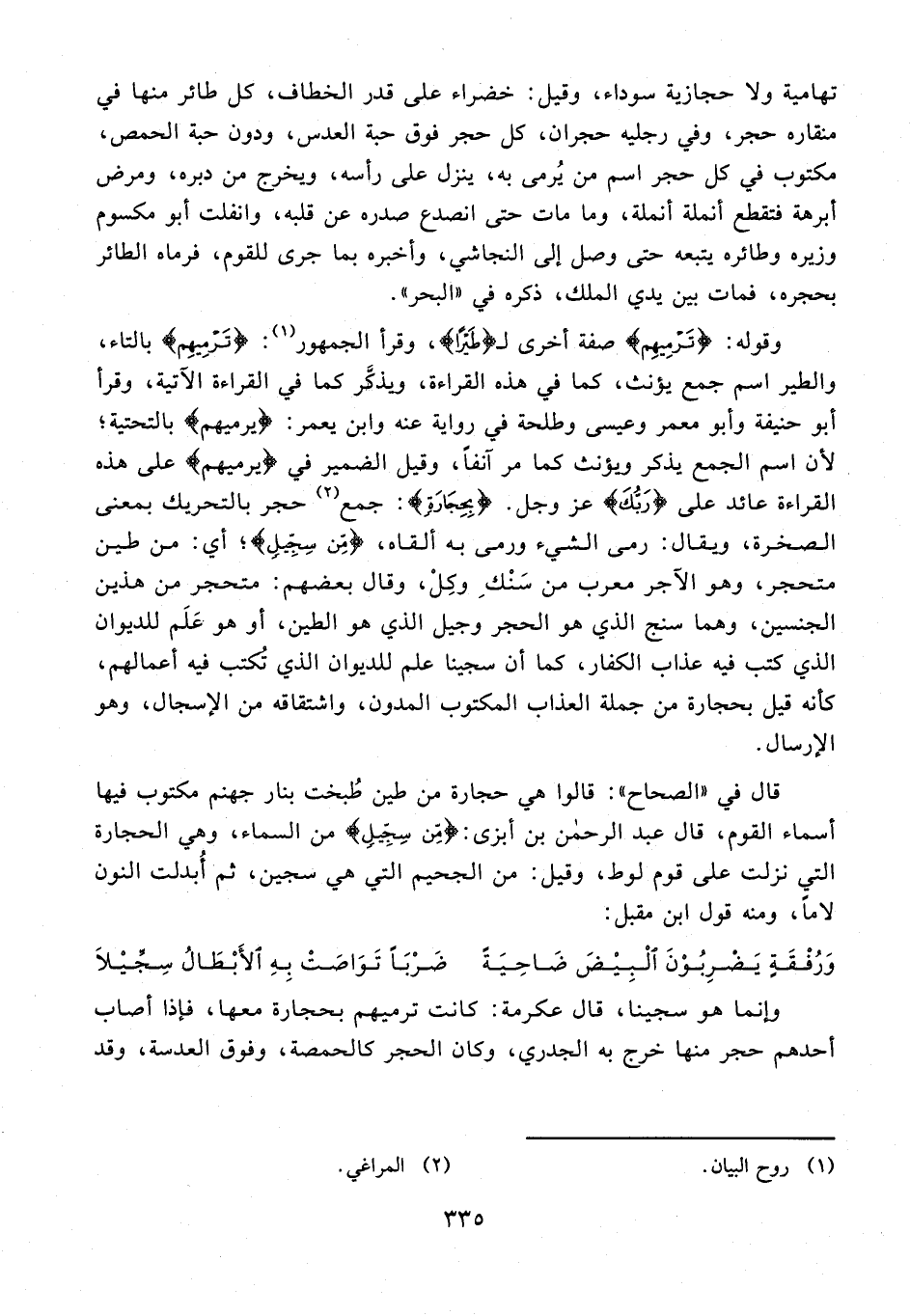 قال في "الصحاح": قالوا هي حجارة من طين طُبخت بنار جهنم مكتوب فيها أسماء القوم، قال عبد الرحمن بن أبزى: {مِنْ سِجِّيلٍ} من السماء، وهي الحجارة التي نزلت على قوم لوط، وقيل: من الجحيم التي هي سجين، ثم أُبدلت النون لامًا، ومنه قول ابن مقبل: