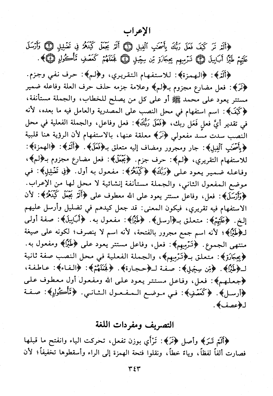 {أَلَمْ}: {الهمزة}: للاستفهام التقريري، و {لم}: حرف نفي وجزم. {تَر}: فعل مضارع مجزوم بـ {لم} وعلامة جزمه حذف حرف العلة وفاعله ضمير مستتر يعود على محمد - صلى الله عليه وسلم - أو على كل من يصلح للخطاب، والجملة مستأنفة، {كَيْفَ}: اسم استفهام في محل النصب على المصدرية والعامل فيه ما بعده؛ لأنه في تقدير أيَّ فعلِ فَعَل ربك، {فَعَلَ رَبُّكَ}: فعل وفاعل، والجملة الفعلية في محل النصب سدت مسد مفعولي {تَرَ} معلقة عنها، بالاستفهام لأن الرؤية هنا قلبية {بِأَصْحَابِ الْفِيلِ}: جار ومجرور ومضاف إليه متعلق بـ {فَعَلَ}. {أَلَمْ}: {الهمزة}: للاستفهام التقريري، {لم}: حرف جزم. {يَجْعَلْ}: فعل مضارع مجزوم بـ {لم}، وفاعله ضمير يعود على {رَبُّكَ} {كَيْدَهُمْ}: مفعول به أول. {في تَضْلِيلٍ}: في موضع المفعول الثاني، والجملة مستأنفة إنشائية لا محل لها من الإعراب. {وَأَرْسَلَ}: فعل، وفاعل مستتريعود على الله معطوف على {أَلَمْ يَجْعَلْ كَيْدَهُمْ}: لأن الاستفهام فيه تقريري، فيكون المعنى: قد جعل كيدهم في تضليل وأرسل عليهم إلخ. {عَلَيْهِمْ}: متعلق بـ {أَرْسَلَ}. {طَيْرًا}: مفعول به. {أَبَابِيلَ}: صفة أولى لـ {طَيْرًا}؛ لأنه اسم جمع مجرور بالفتحة؛ لأنه اسم لا ينصرف؛ لكونه على صيغة منتهى المجموع. {تَرْمِيهِمْ}: فعل, وفاعل مستتر يعود على {طَيْرًا} ومفعول به. {بِحِجَارَةٍ}: متعلق بـ {تَرْمِيهِمْ}، والجملة الفعلية في محل النصب صفة ثانية لـ {طَيْرًا}. {مِنْ سِجِّيلٍ}: صفة لـ {حجارة}. {فَجَعَلَهُمْ}: {الفاء}: عاطفة، {جعلهم}: فعل، وفاعل مستتر يعود على الله ومفعول أول معطوف على {أرسل}. {كَعَصْفٍ}: في موضع المفعول الثاني. {مَأْكُولٍ}: صفة لـ {عصف}.