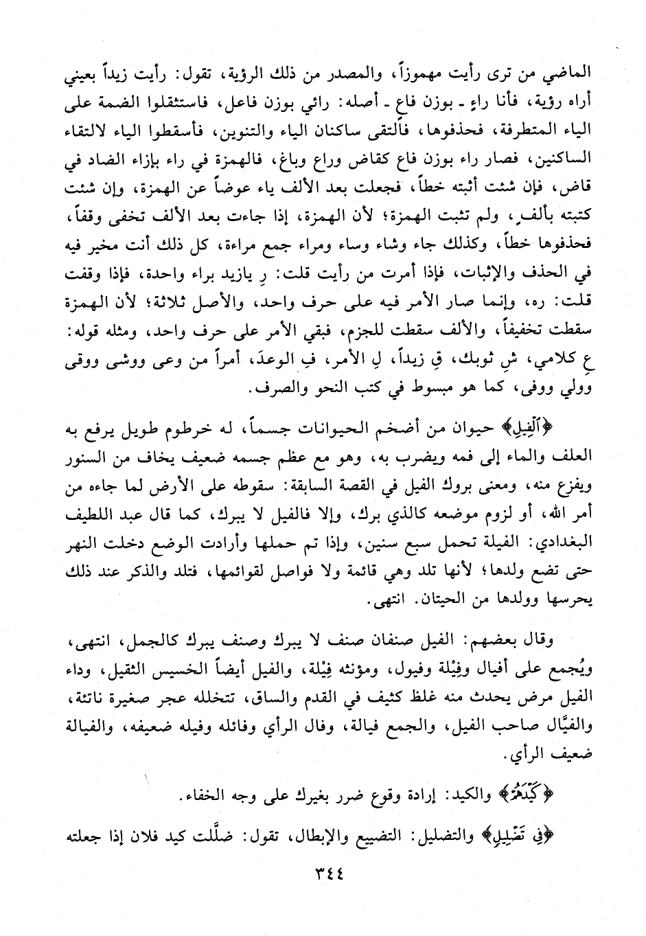{الْفِيلِ} حيوان من أضخم الحيوانات جسمًا، له خرطوم طويل يرفع به العلف والماء إلى فمه ويضرب به، وهو مع عظم جسمه ضعيف يخاف من السنور ويفزع منه، ومعنى بروك الفيل في القصة السابقة: سقوطه على الأرض لما جاءه من أمر الله، أو لزوم موضعه كالذي برك، وإلا فالفيل لا يبرك، كما قال عبد اللطيف البغدادي: الفيلة تحمل سبع سنين، وإذا تم حملها وأرادت الوضع دخلت النهر حتى تضع ولدها؛ لأنها تلد وهي قائمة ولا فواصل لقوائمها، فتلد والذكر عند ذلك يحرسها وولدها من الحيتان. انتهى.