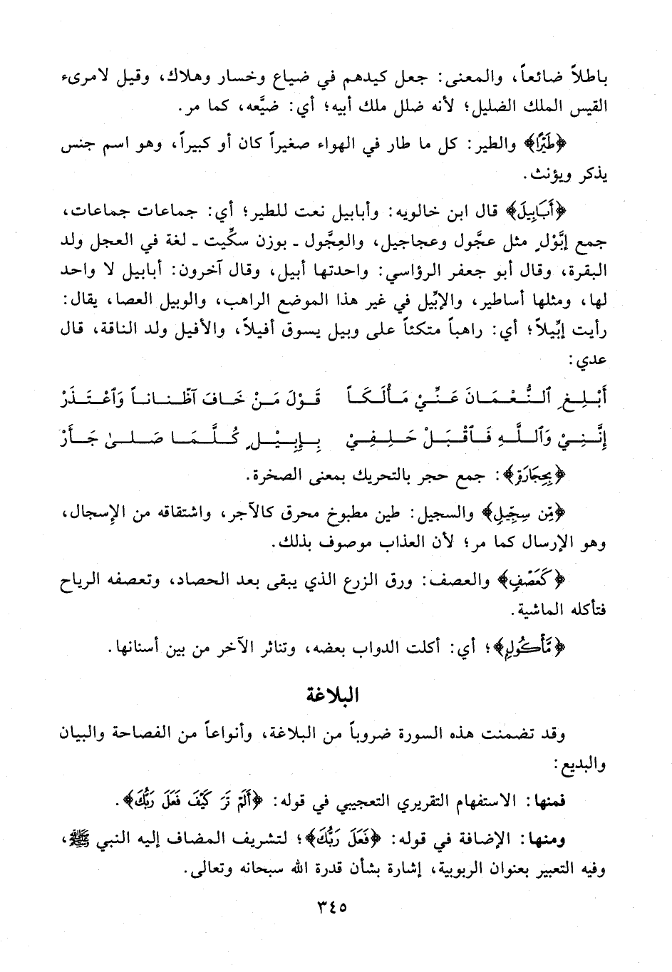 {أَبَابِيلَ} قال ابن خالويه: وأبابيل نعت للطير؛ أي: جماعات جماعات، جمع إبَّوْلٍ مثل عجَّول وعجاجيل، والعِجَّول - بوزن سكيت - لغة في العجل ولد البقرة، وقال أبو جعفر الرؤاسي: واحدتها أبيل، وقال آخرون: أبابيل لا واحد لها، ومثلها أساطير، والإبِّيل في غير هذا الموضع الراهب، والوبيل العصا، يقال: رأيت إبِّيلًا؛ أي: راهبًا متكئًا على وبيل يسوق أفيلًا، والأفيل ولد الناقة، قال عدي: